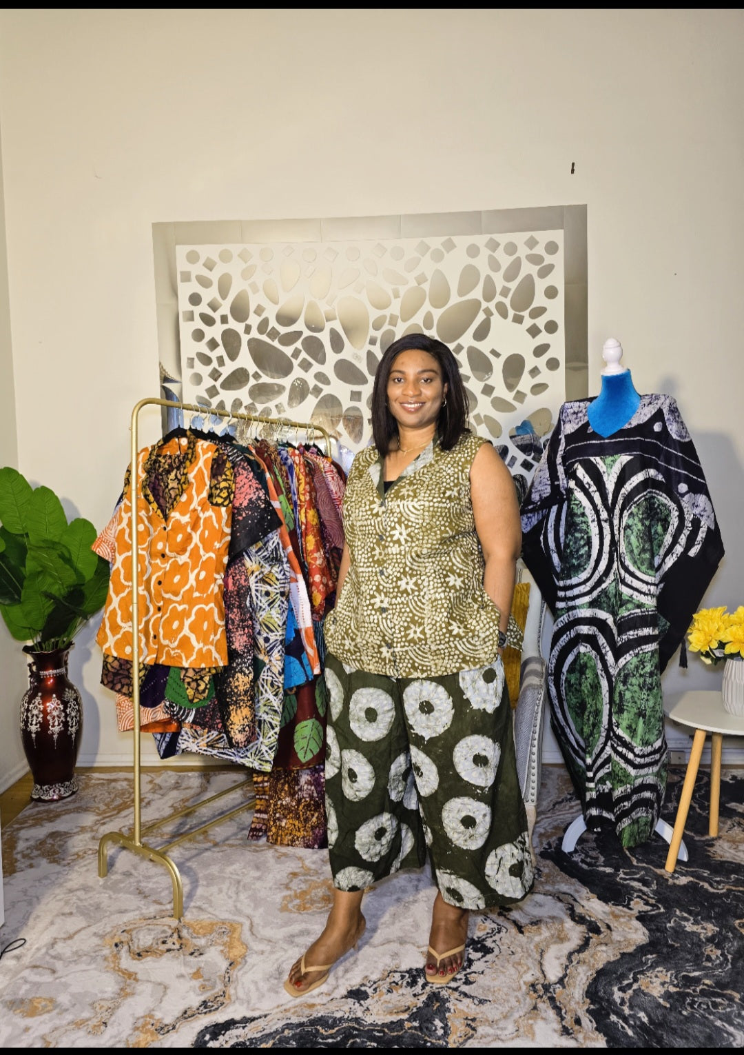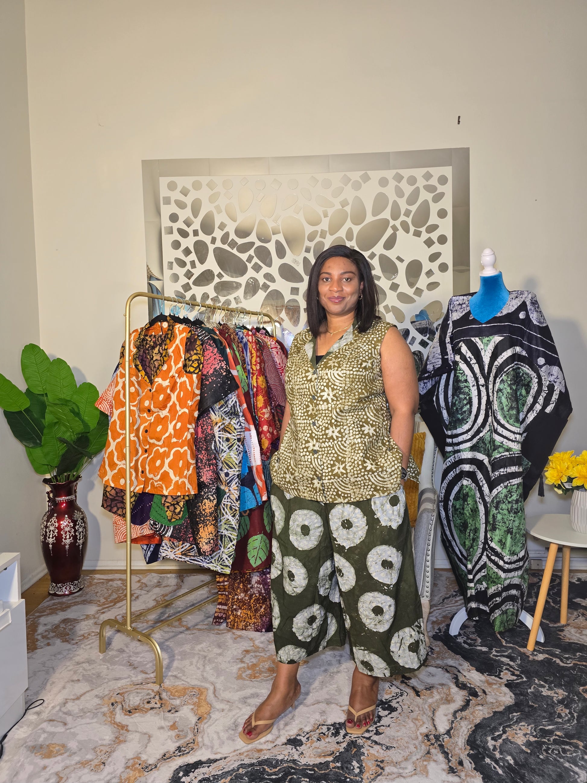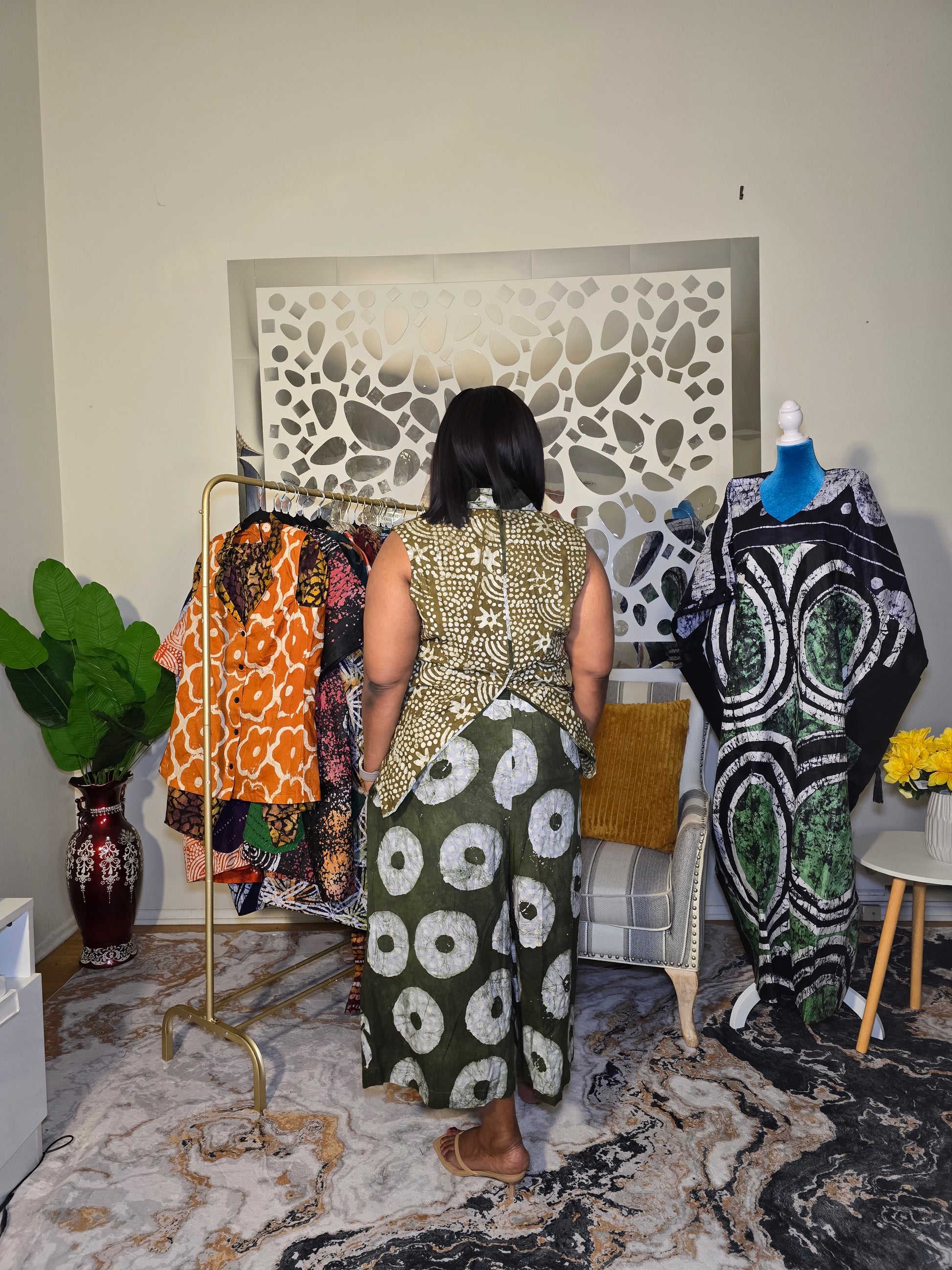This olive green three-quarter sleeve two-piece set features a bold cotton adire design. Available in XL with top bust size 46 and pant hip size 52, it combines style and versatility, making it an ideal choice for the modern woman’s everyday wardrobe.