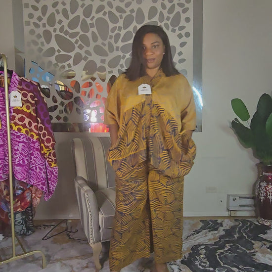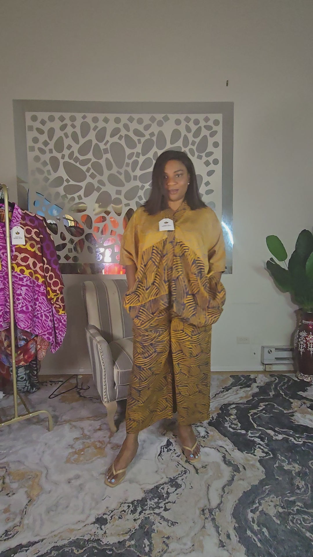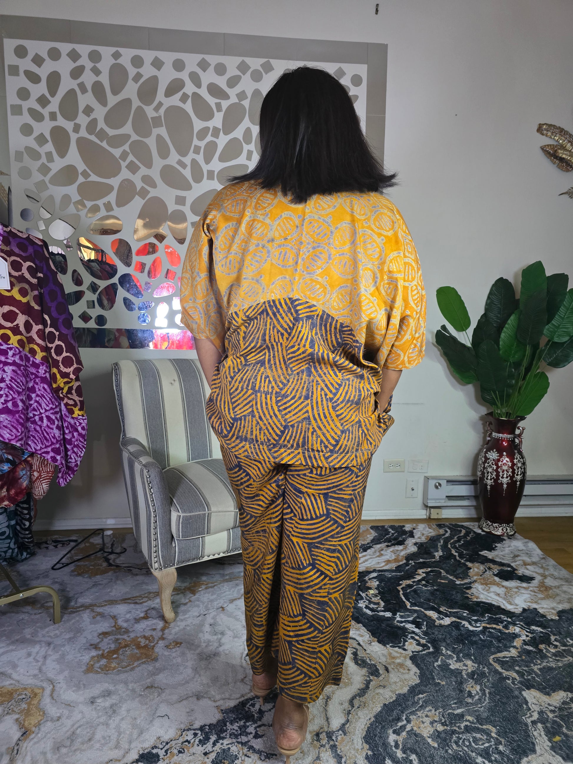 This set features a crepe and cotton adire three-quarter pant paired with a free-fit short dashiki top, designed to comfortably fit US sizes 12-14. The pants fit US sizes 12-14 with a length of 35-36 inches and hip measurement of 48-50 inches, offering a flattering, relaxed fit. Perfect for effortless style and comfort. Size Large.