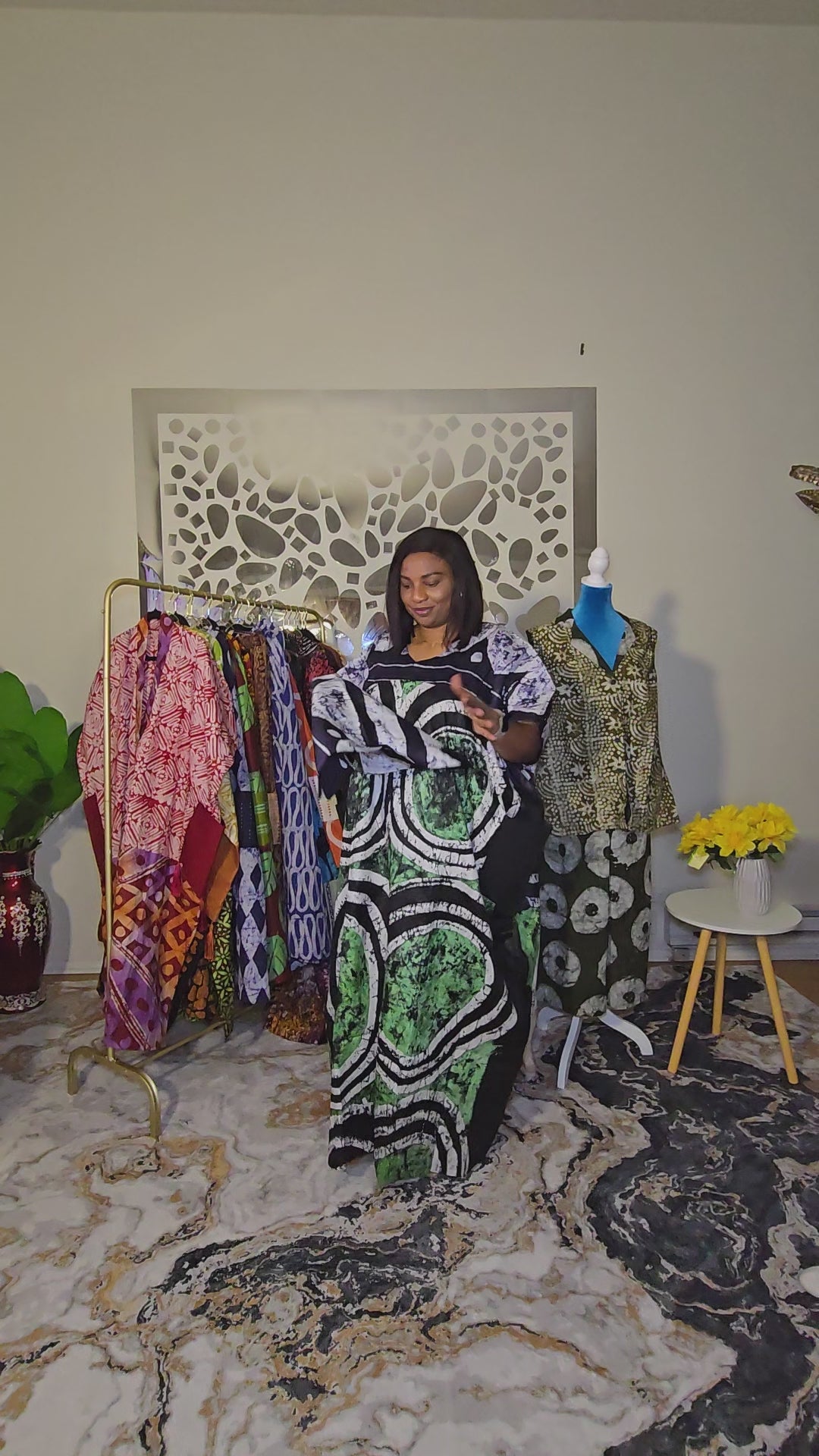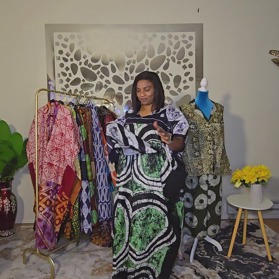 This ankle-length dress features a striking green and black underburst design crafted from premium adire fabric, measuring 55-56cm in length. It includes a front slit and a high-quality aso oke pocket, combining style and tradition. Designed as one-size-fits-all, it's ideal for ceremonial occasions and comes complete with a matching scarf.