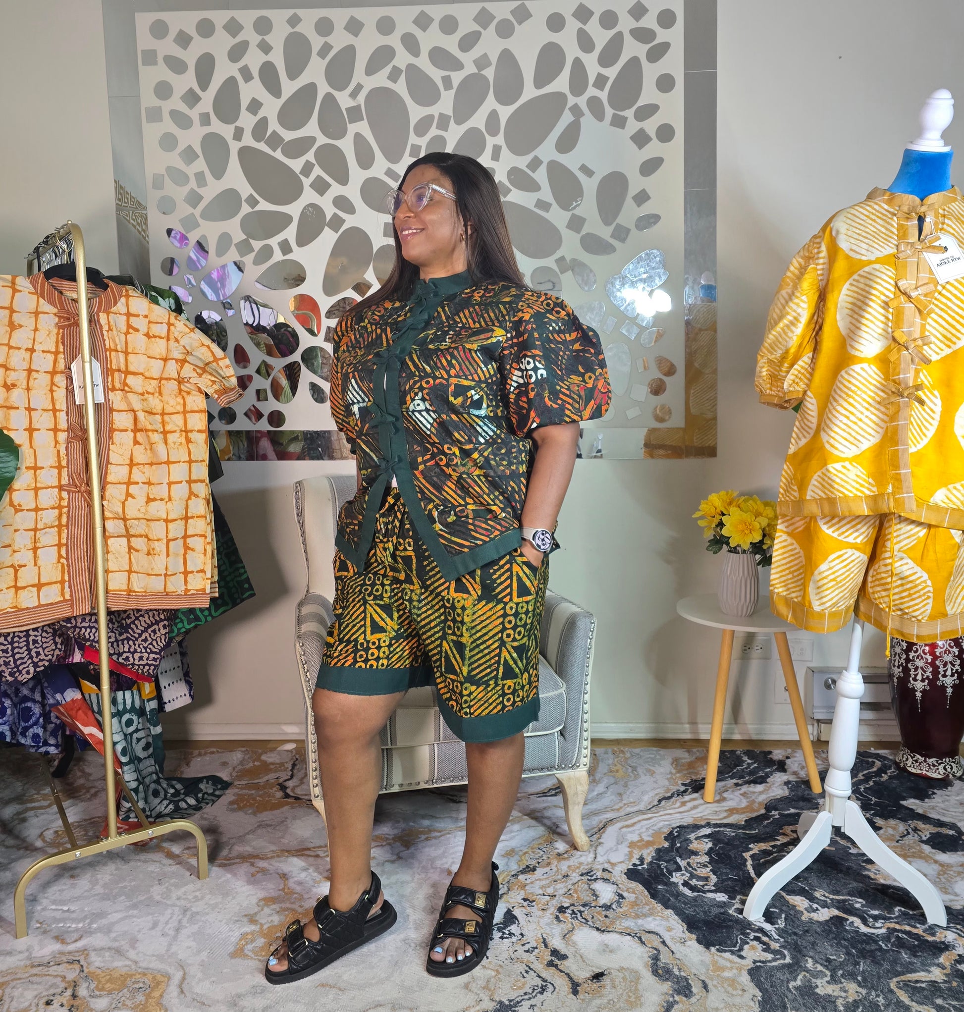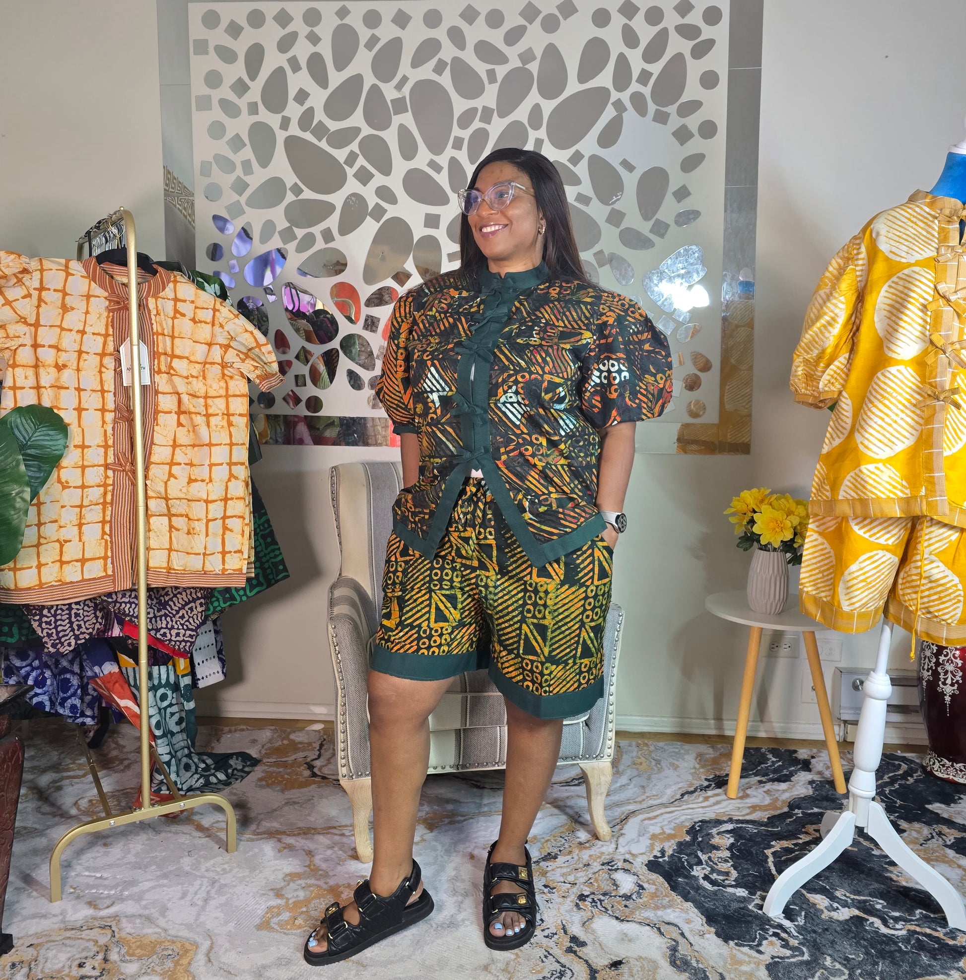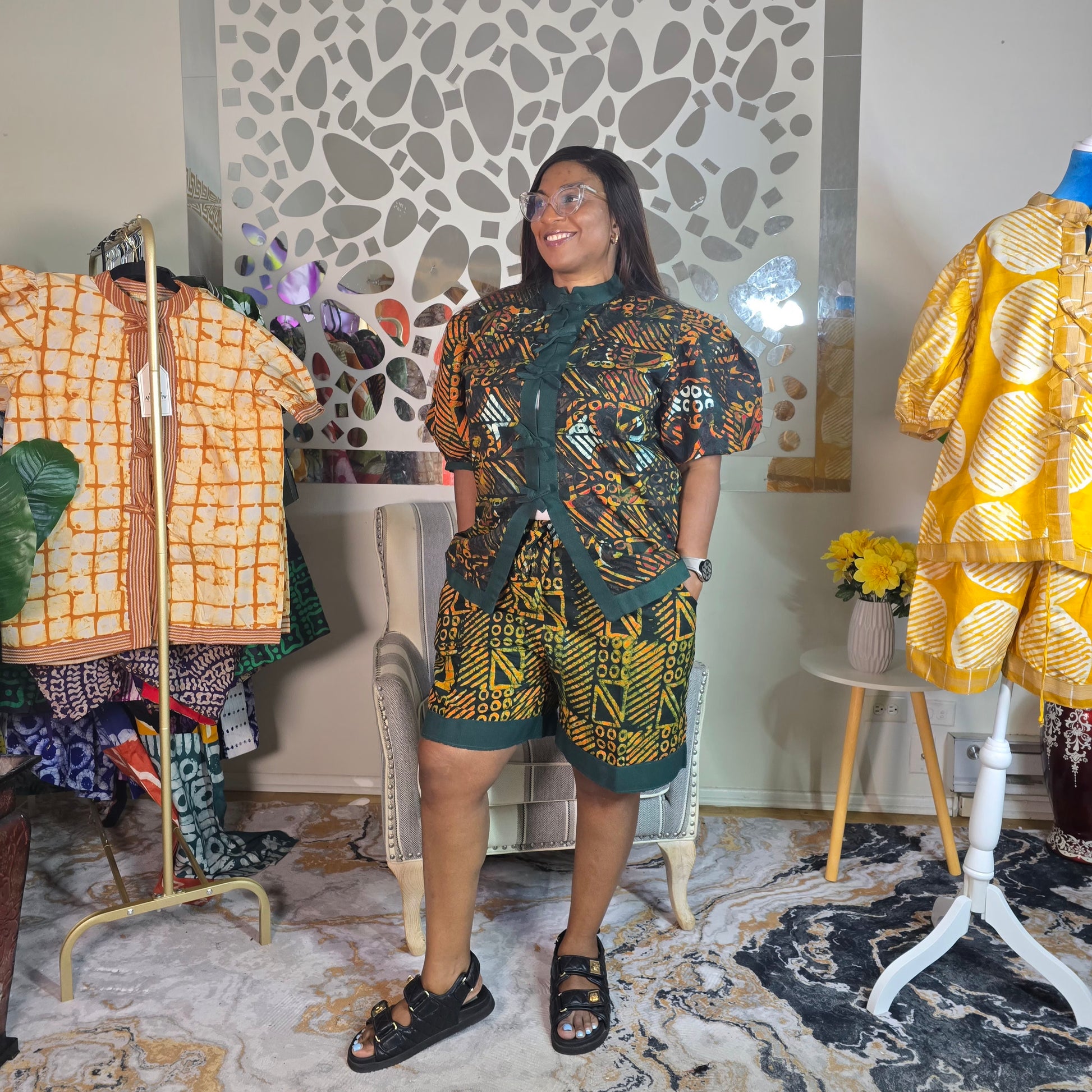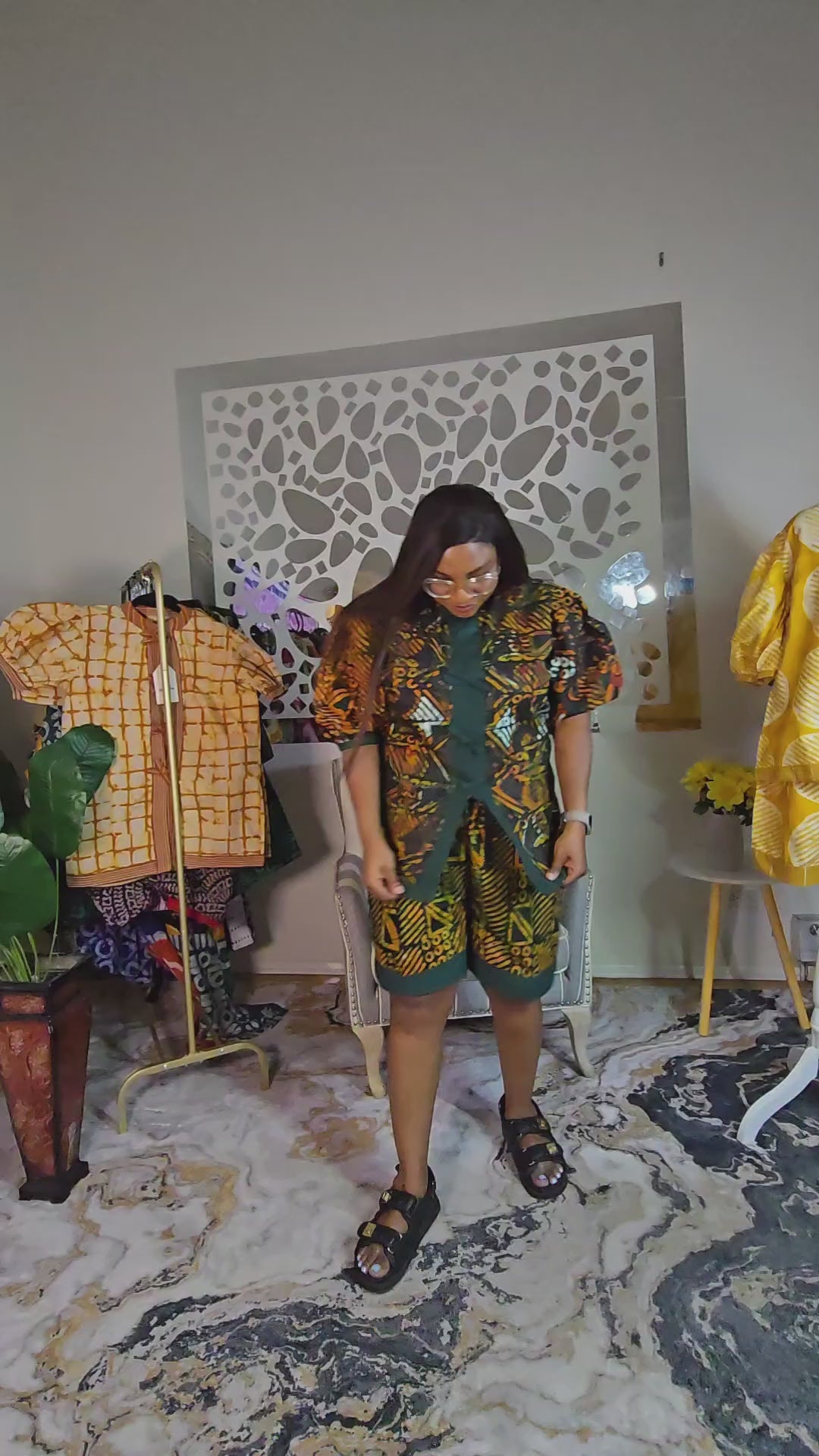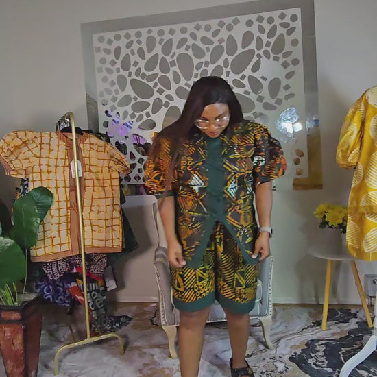 This polish batik Adire 2-piece short set features tapered details with aso oke accents on the sleeves, chest, and hem, making it ideal for casual outings. The yellow set in size Large offers a top with bust 46 inches and length 28, paired with shorts that have a 48-inch hip and 20-inch length. Stylish and comfortable, it’s perfect for adding flair to your everyday look.