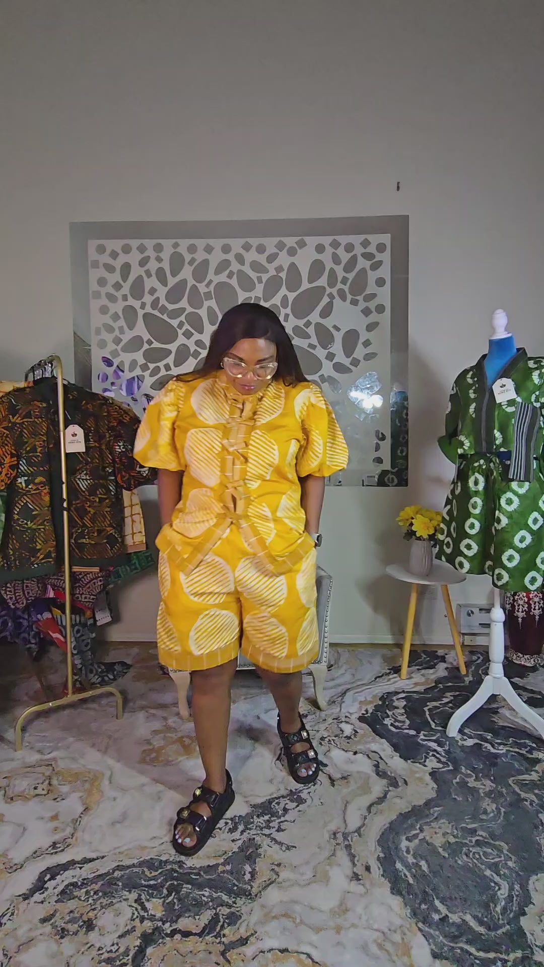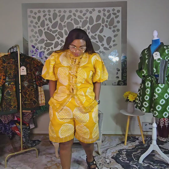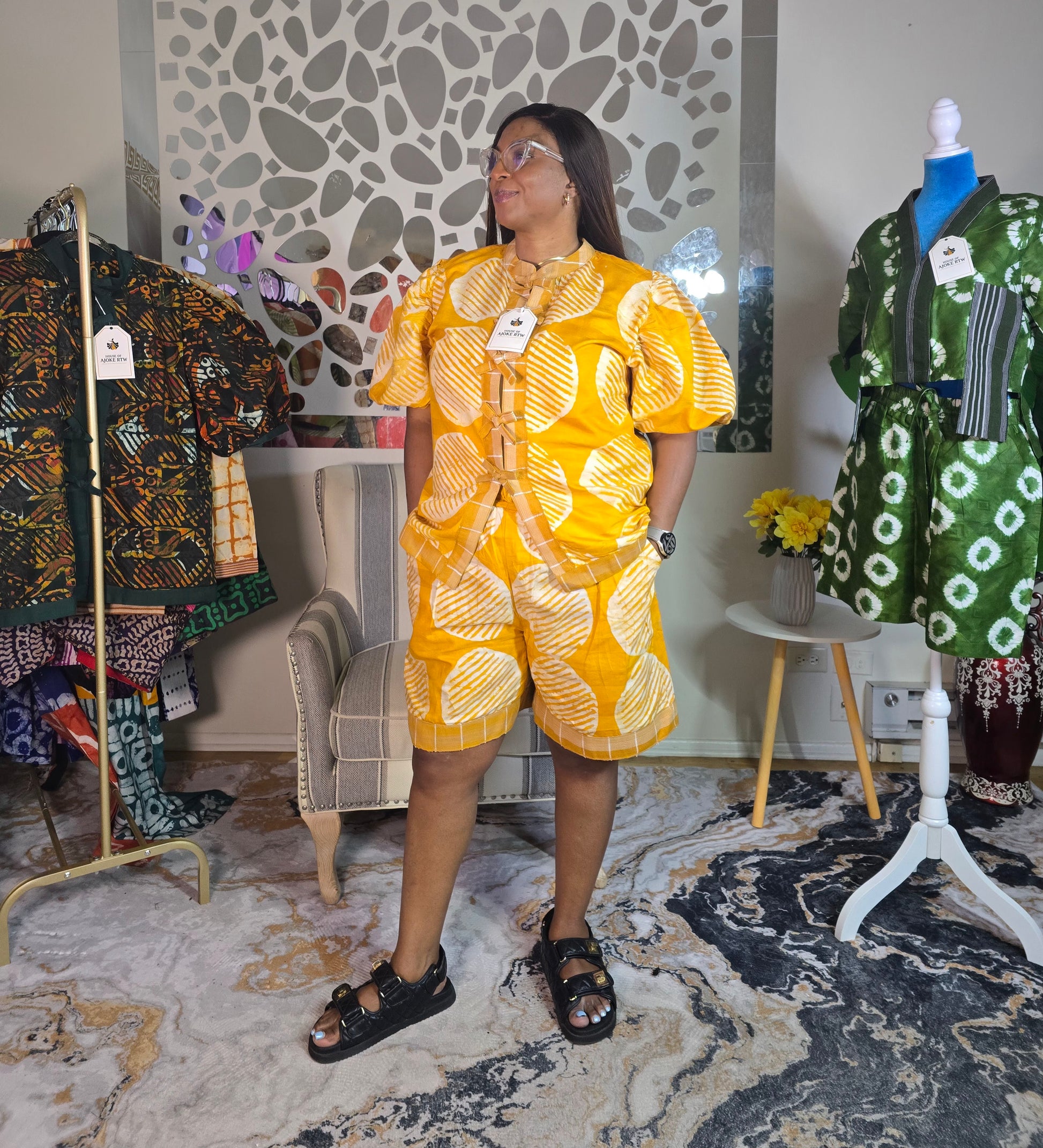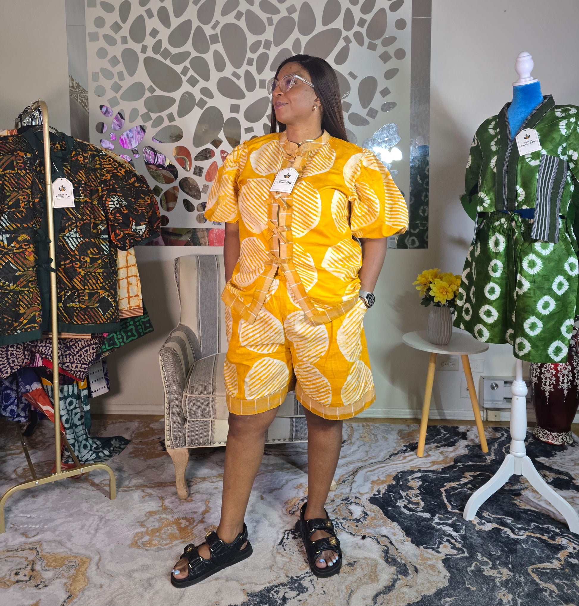 This polish batik Adire 2-piece short set features tapered details with aso oke accents on the sleeves, chest, and hem, making it ideal for casual outings. The yellow set in size Large offers a top with bust 48 inches and length 39, paired with shorts that have a 48-inch hip and 21-inch length. Stylish and comfortable, it’s perfect for adding flair to your everyday look.