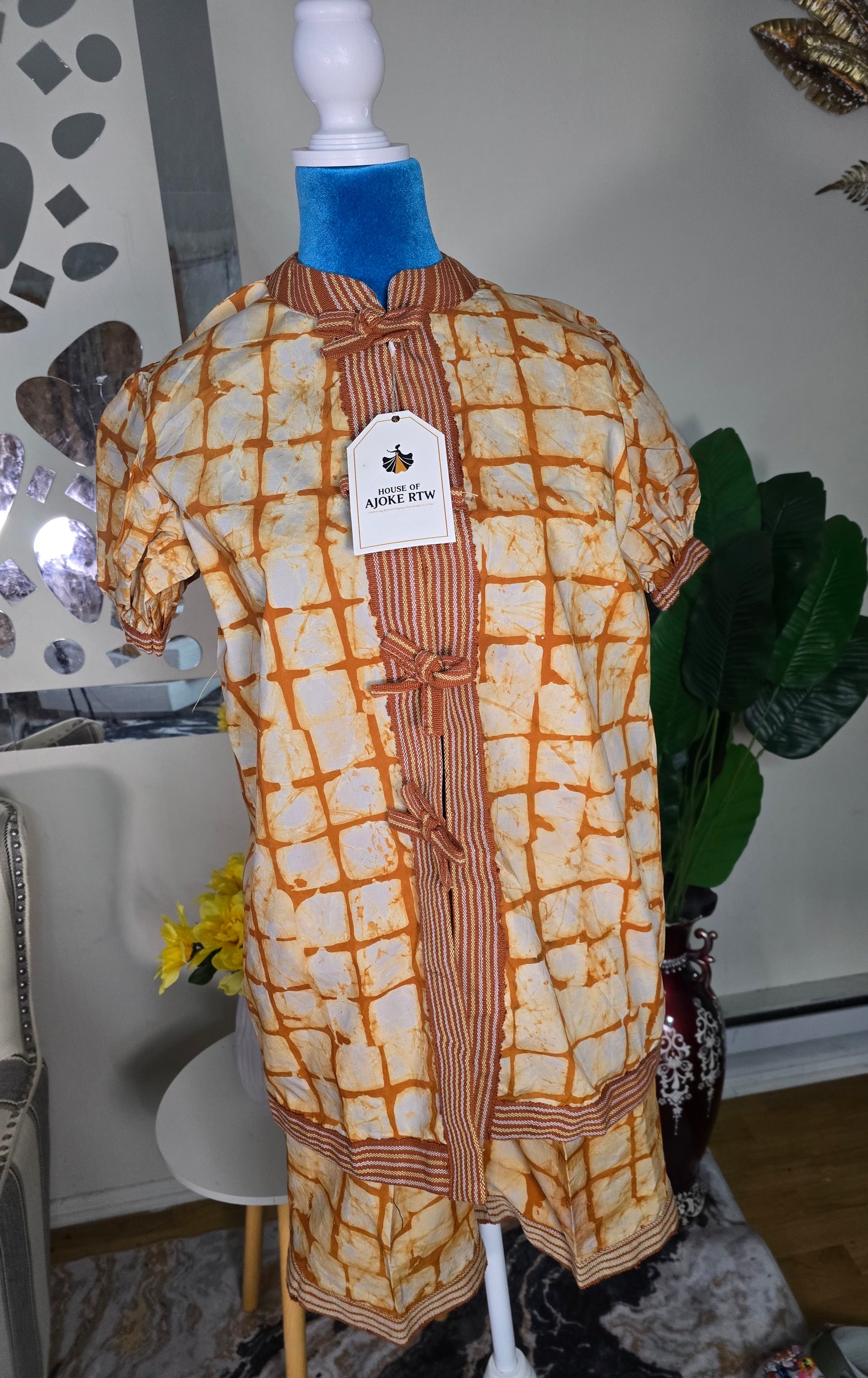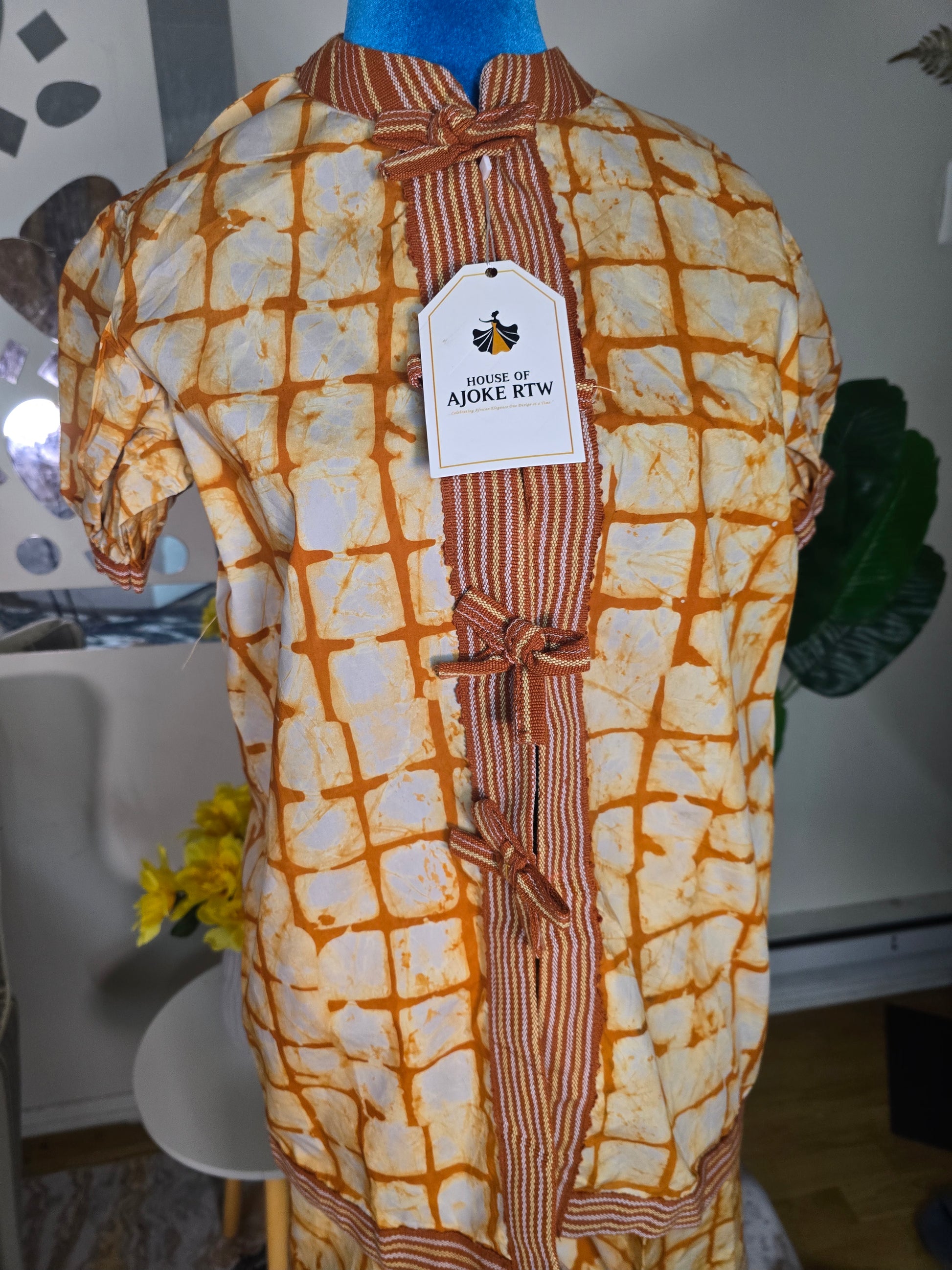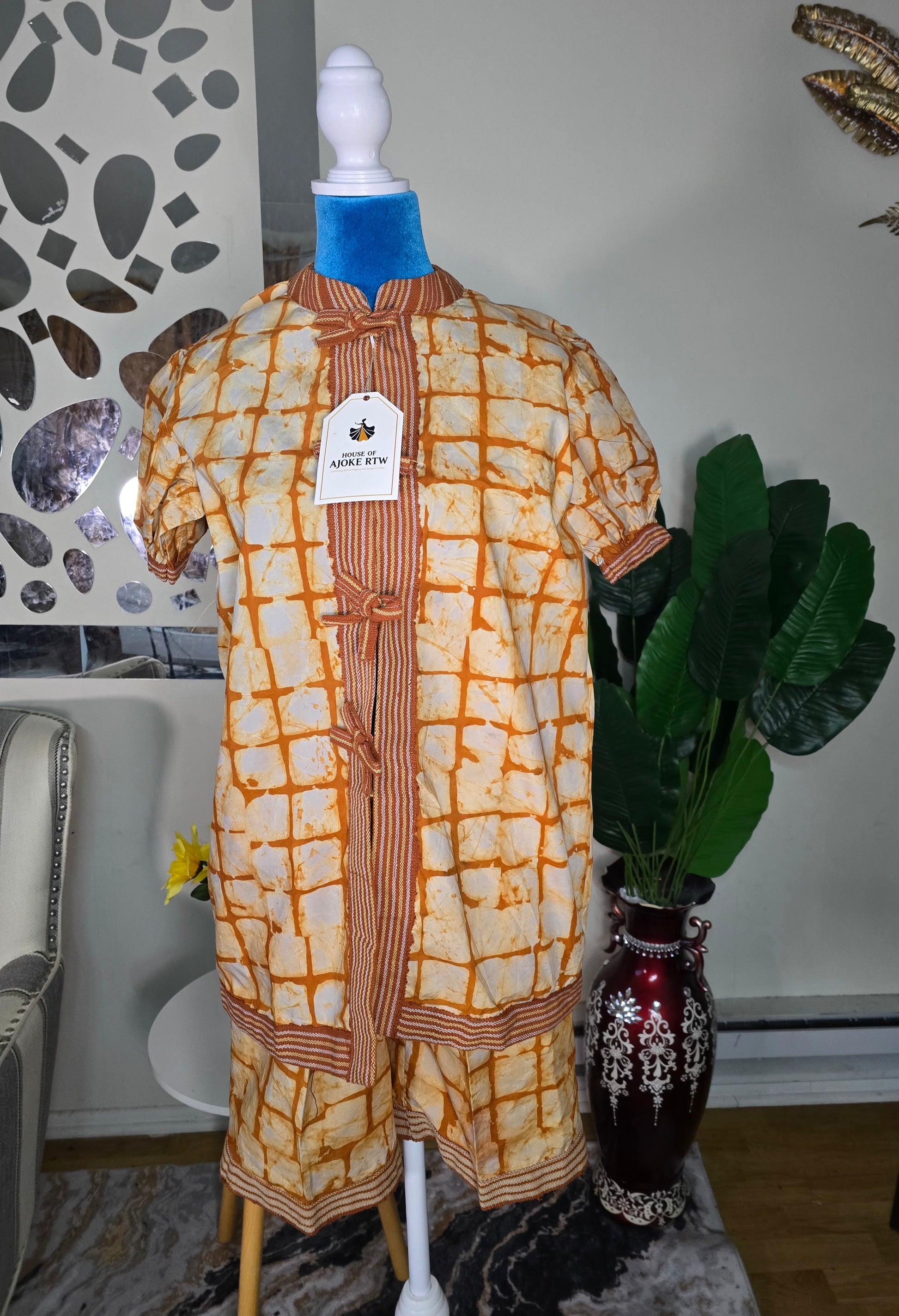 This polish batik Adire 2-piece short set features tapered details with aso oke accents on the sleeves, chest, and hem, making it ideal for casual outings. The burnt orange set in size small offers a top with bust 42 and length 39, paired with shorts that have a 40-inch hip and 19-inch length. Stylish and comfortable, it’s perfect for adding flair to your everyday look.