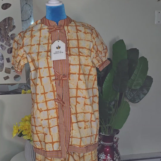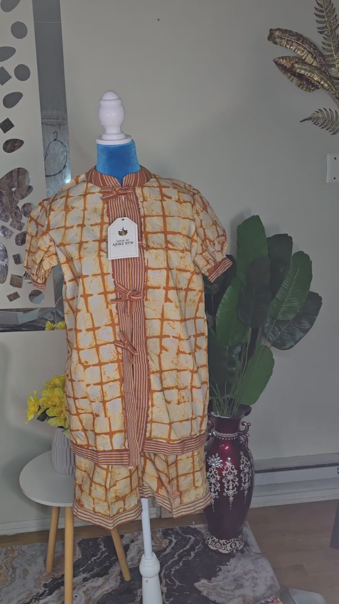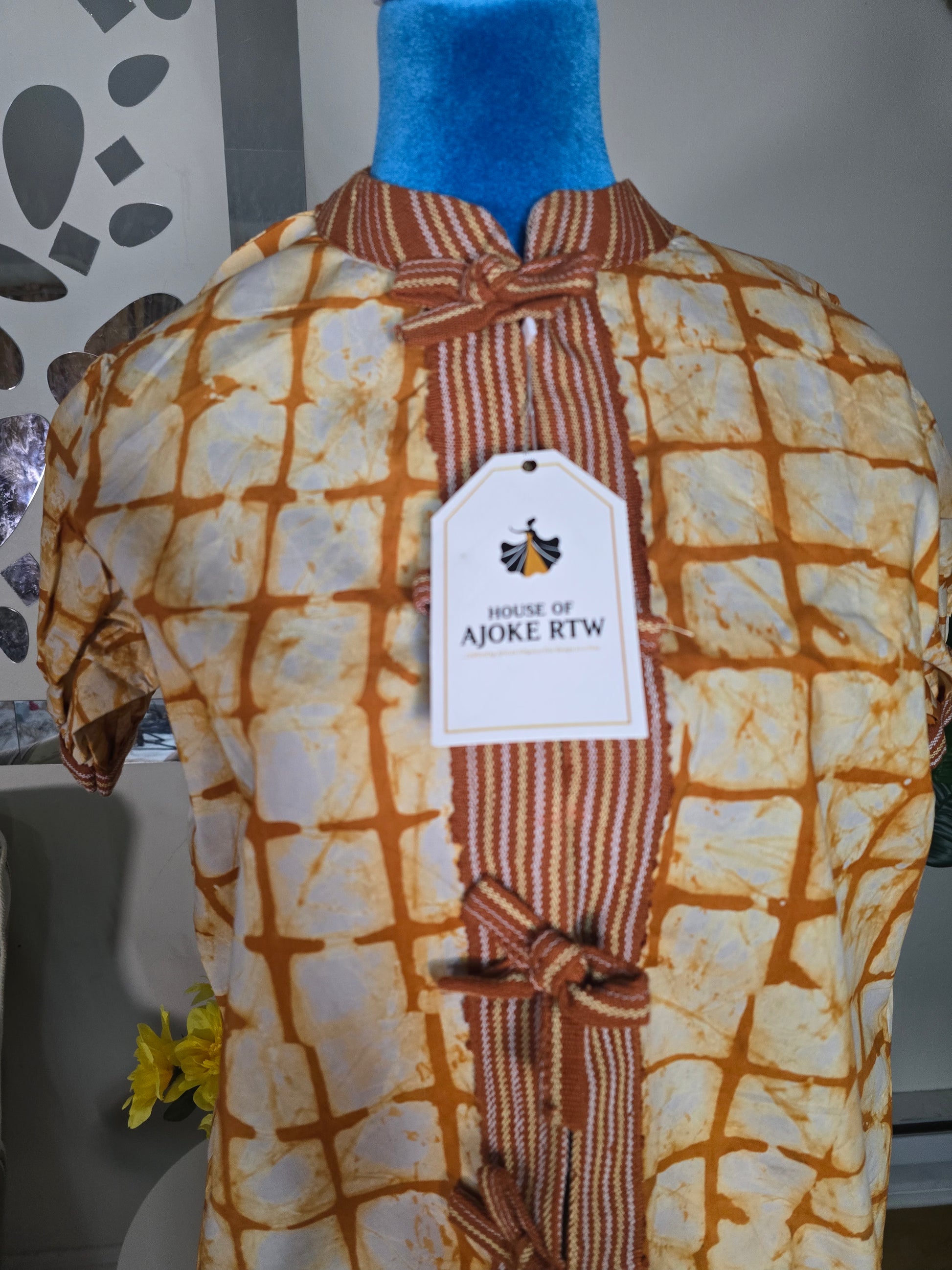 This polish batik Adire 2-piece short set features tapered details with aso oke accents on the sleeves, chest, and hem, making it ideal for casual outings. The burnt orange set in size small offers a top with bust 42 and length 39, paired with shorts that have a 40-inch hip and 19-inch length. Stylish and comfortable, it’s perfect for adding flair to your everyday look.