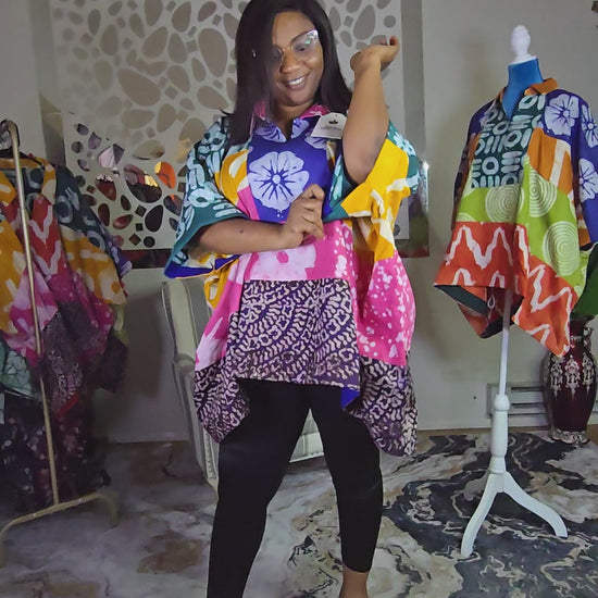 Enjoy both comfort and style with the Ayinke Patched Adire top, crafted from 100% cotton polish batik adire. Its flowing fabric and distinctive aso oke trims bring an elegant and unique flair that suits every season. Made for queens of all generations, this top seamlessly blends cultural heritage with everyday sophistication. Available in size L, featuring an 80-inch bust, 30-inch front length, and 32-inch back length.