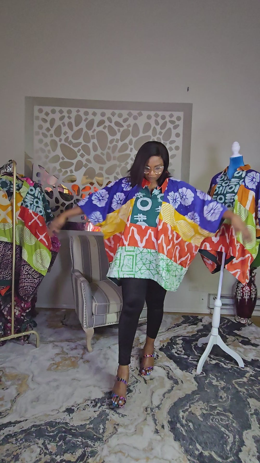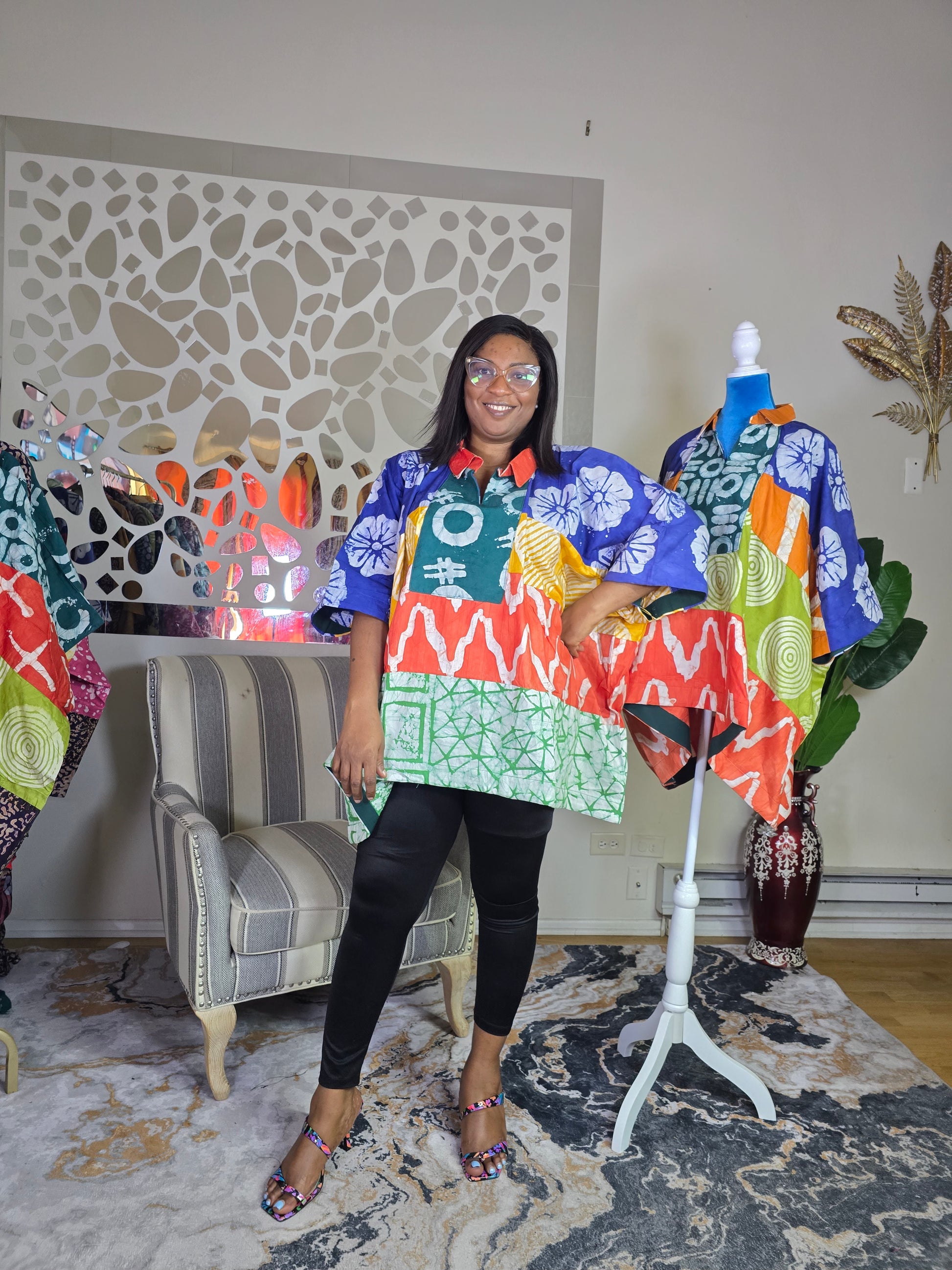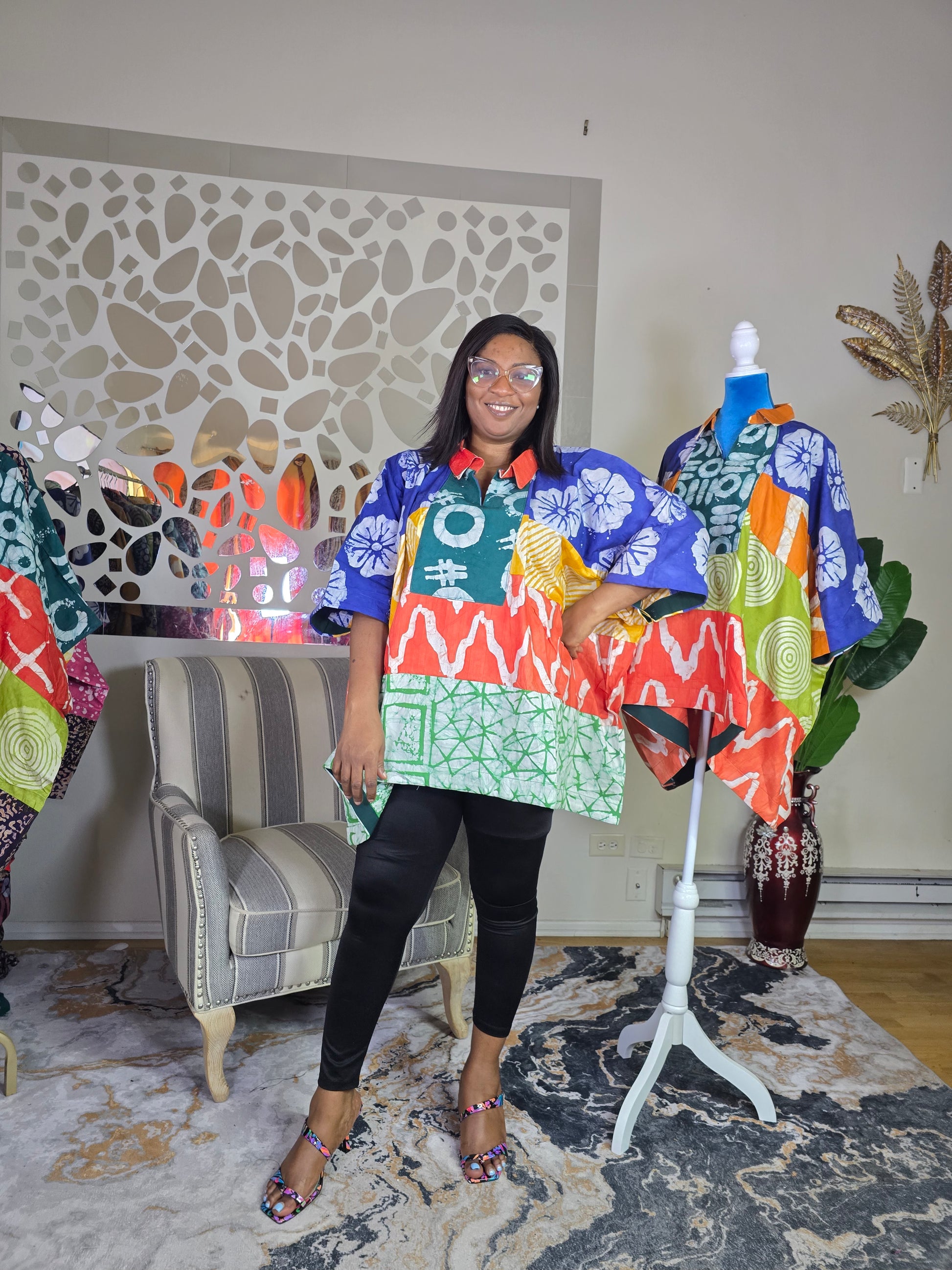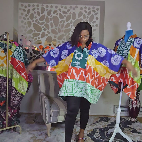 Enjoy both comfort and style with the Ayinke Patched Adire top, crafted from 100% cotton polish batik adire. Its flowing fabric and distinctive aso oke trims bring an elegant and unique flair that suits every season. Made for queens of all generations, this top seamlessly blends cultural heritage with everyday sophistication. Available in size XL, featuring an 80-inch bust, 30-inch front length, and 32-inch back length.