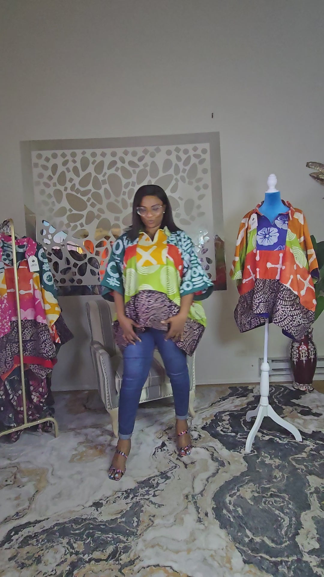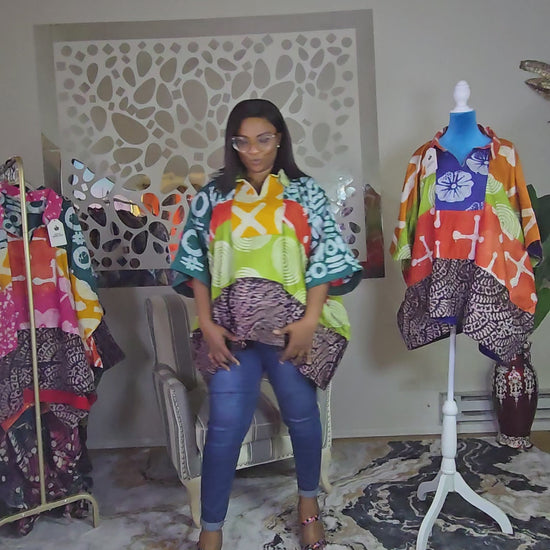 Enjoy both comfort and style with the Ayinke Patched Adire top, crafted from 100% cotton polish batik adire. Its flowing fabric and distinctive aso oke trims bring an elegant and unique flair that suits every season. Made for queens of all generations, this top seamlessly blends cultural heritage with everyday sophistication. Available in size L, featuring an 80-inch bust, 30-inch front length, and 32-inch back length.
