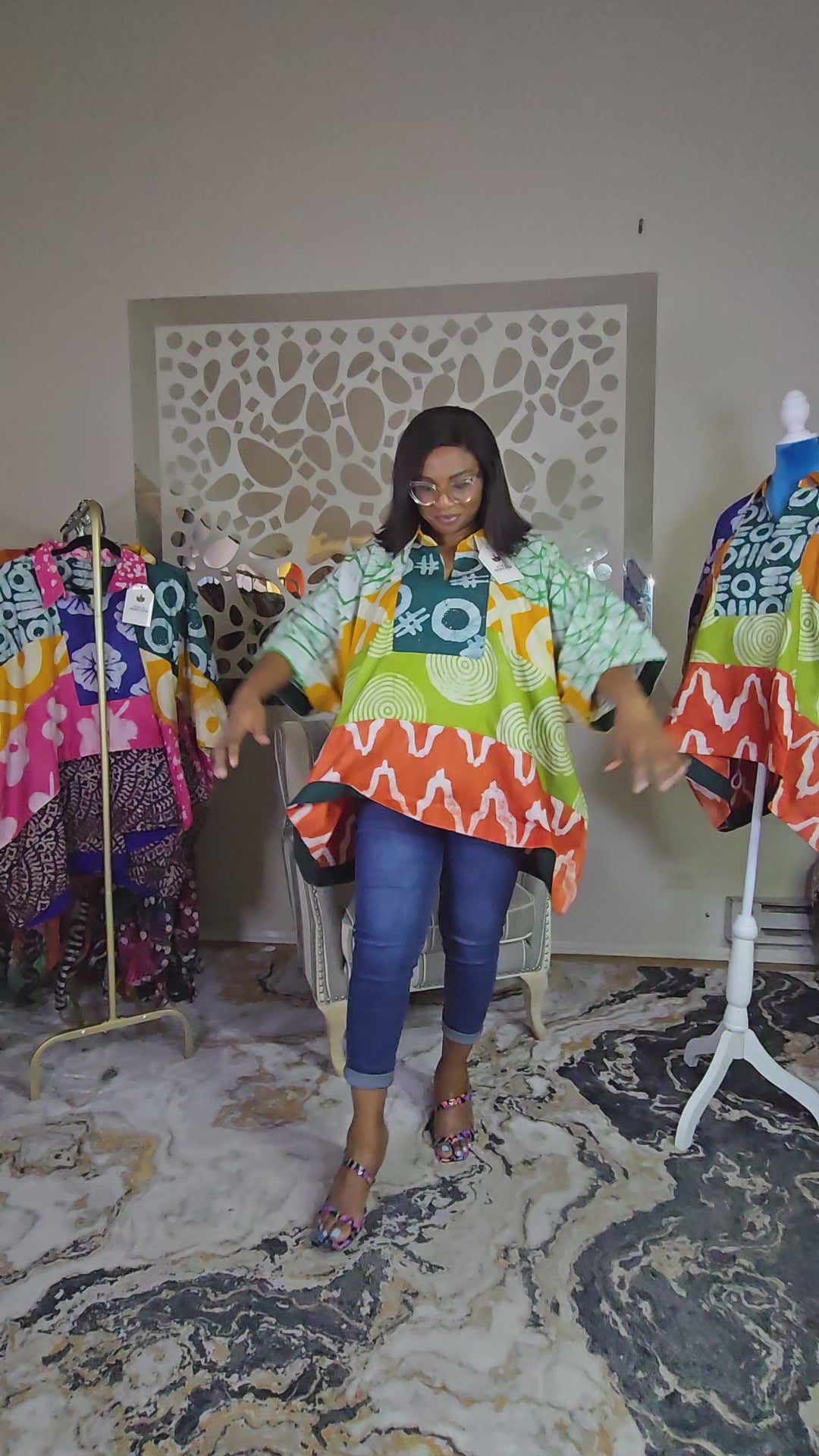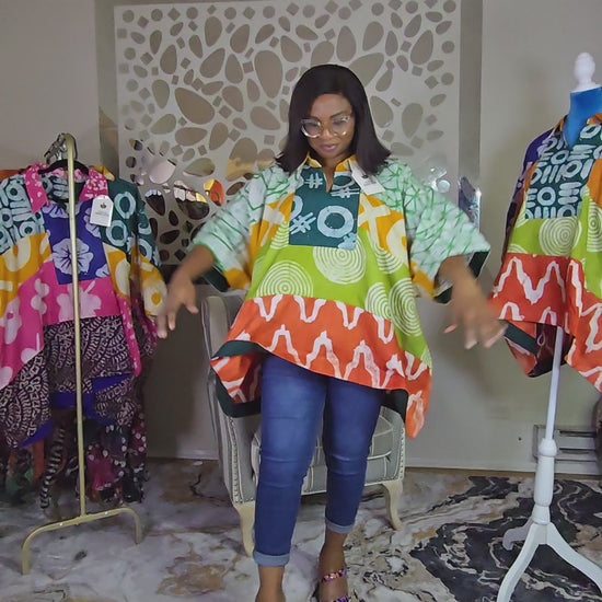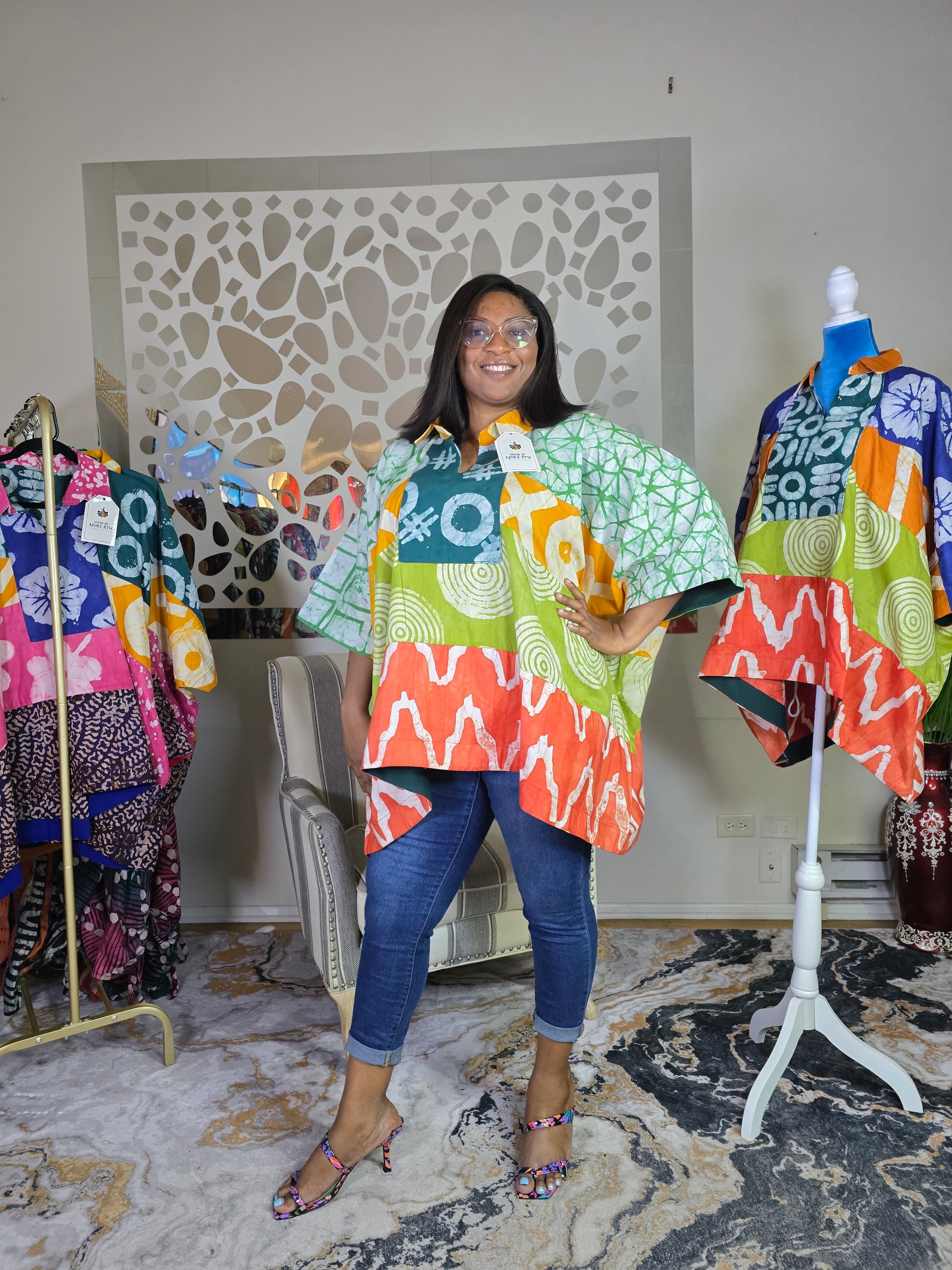 Enjoy both comfort and style with the Ayinke Patched Adire top, crafted from 100% cotton polish batik adire. Its flowing fabric and distinctive aso oke trims bring an elegant and unique flair that suits every season. Made for queens of all generations, this top seamlessly blends cultural heritage with everyday sophistication. Available in size XL, featuring an 80-inch bust, 32-inch front length, and 33-inch back length.