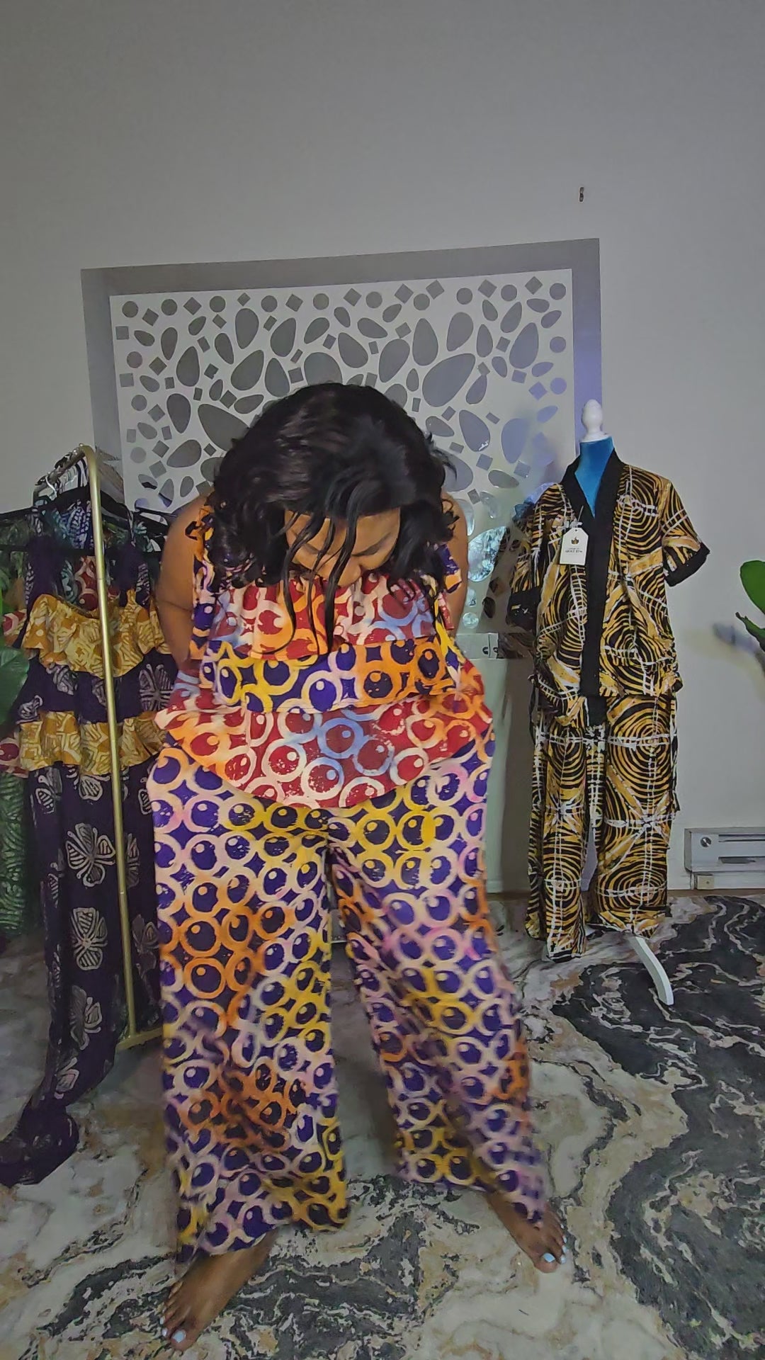 This Ayomi crepe adire jumpsuit in blue and orange is crafted from high-quality crepe adire fabric, ideal for casual yet stylish occasions. Available in Size X Large with a length of 56 inches (excluding the adjustable ropes), it offers customizable looks thanks to its removable ropes. Designed with taller individuals in mind, it can be altered at no additional cost for shorter heights. When worn by a 5’4” model in size Large, the fit is comfortably loose, highlighting its effortlessly elegant style.