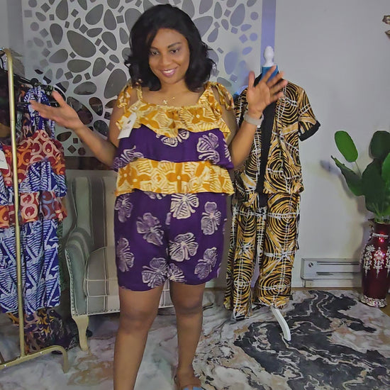 The Ayomi crepe adire playsuit showcases a vibrant purple and yellow and mix match in a Medium size, measuring 28 inches in length before adding the detachable ropes. With a bust size of 44-46 inches and made from premium crepe adire fabric, this playsuit is perfect for relaxed, stylish occasions. The removable ropes allow you to customize your look, adding versatility to your wardrobe essentials.