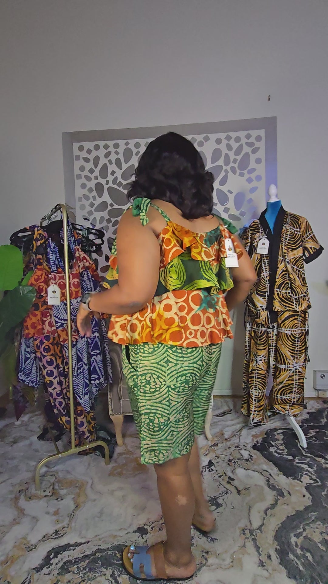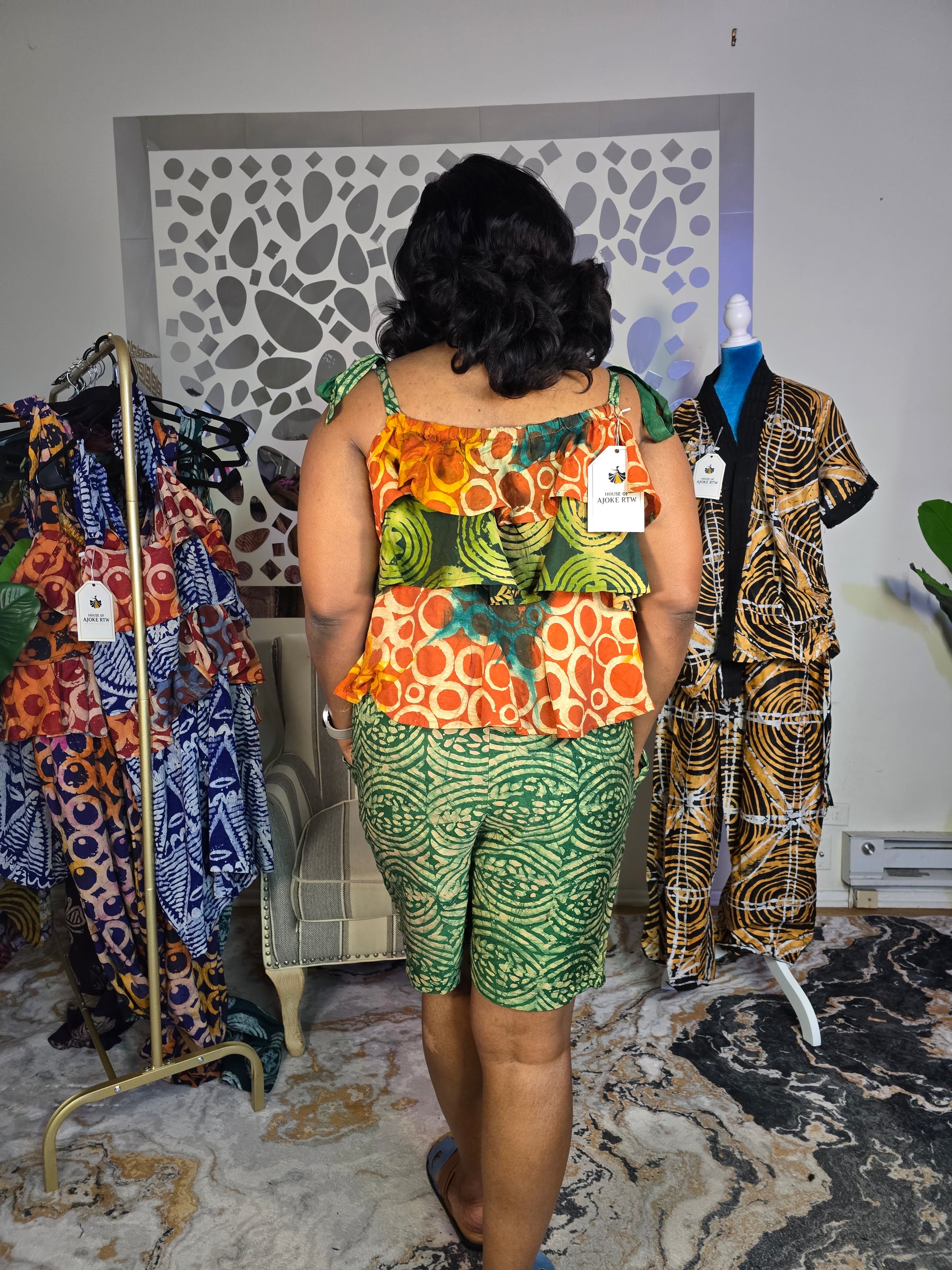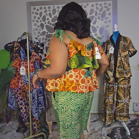 The Ayomi crepe adire playsuit features a striking green and red design in a Large size, with a length of 33 inches (excluding the ropes) and a 50-inch bust. Crafted from high-quality crepe adire fabric, it’s ideal for relaxed, stylish outings. The included removable ropes offer flexible styling options, making this playsuit a versatile addition to your wardrobe.