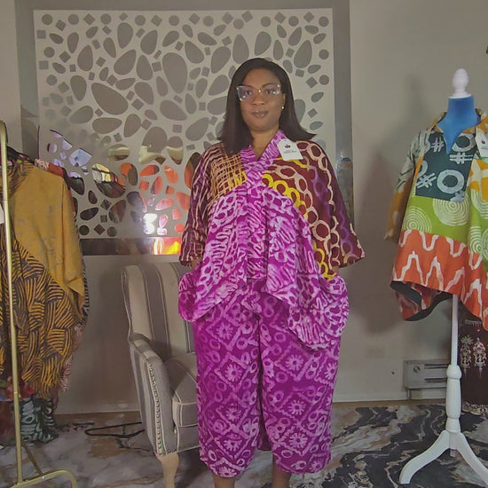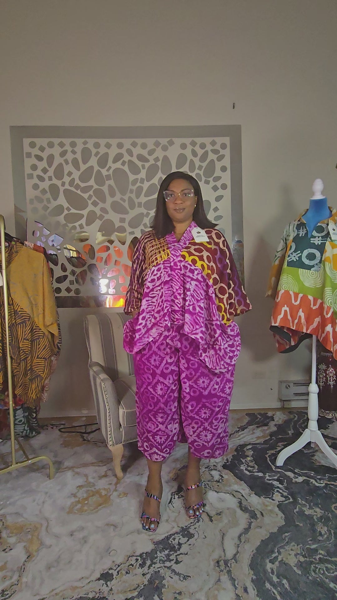 This set features a crepe and cotton adire three-quarter pant paired with a free-fit short dashiki top, designed to comfortably fit US sizes 12-18. The pants fit US sizes 14-16 with a length of 32-33 inches and hip measurement of 51-52 inches, offering a flattering, relaxed fit. Perfect for effortless style and comfort.