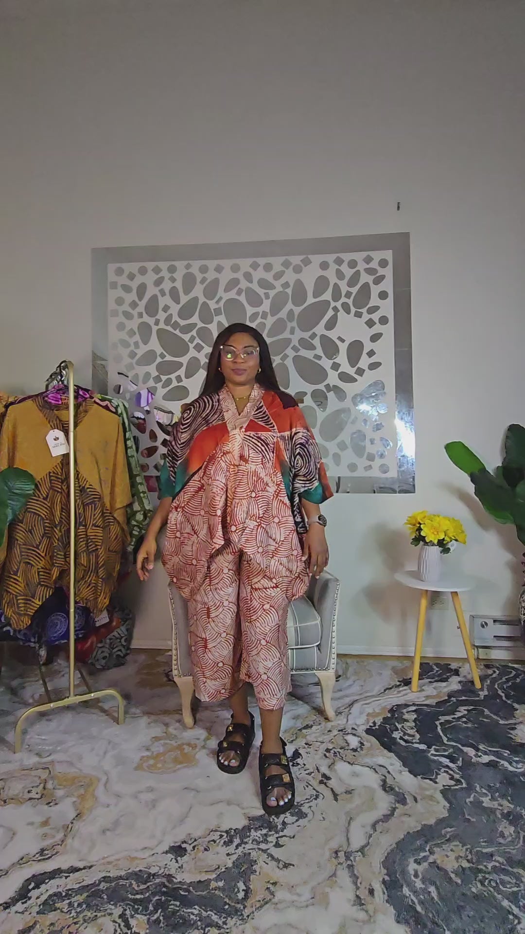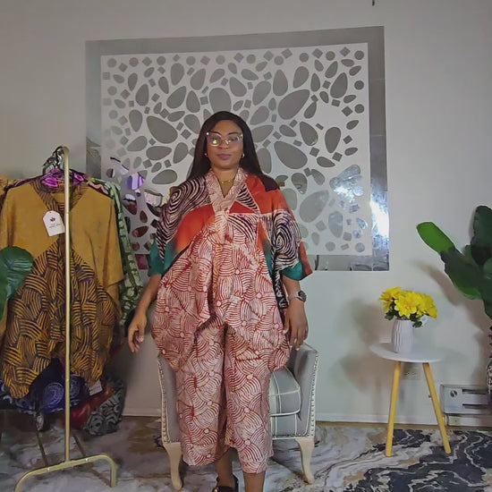 This set features a crepe and big cotton adire three-quarter pant paired with a free-fit short dashiki top, designed to comfortably fit US sizes 12-18. The pants fit US sizes 14-16 with a length of 32-33 inches and hip measurement of 51-52 inches, offering a flattering, relaxed fit. Perfect for effortless style and comfort.