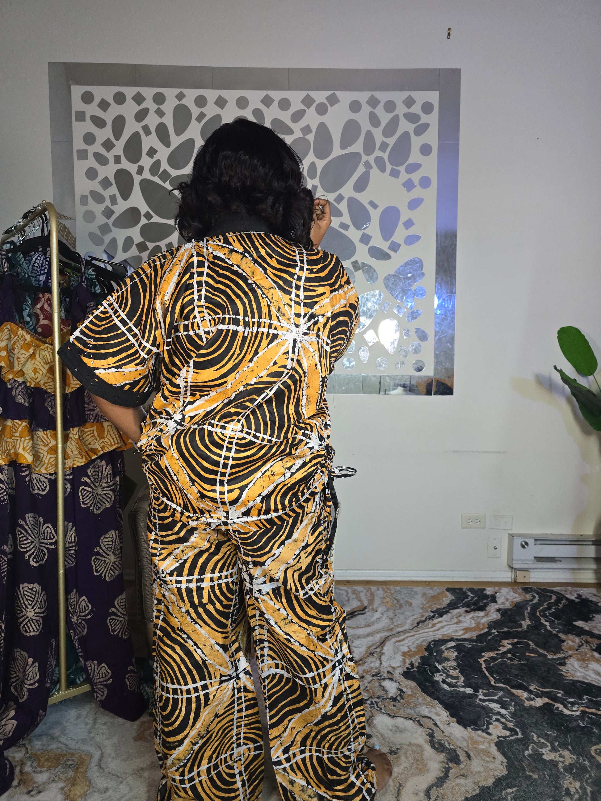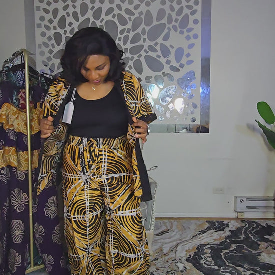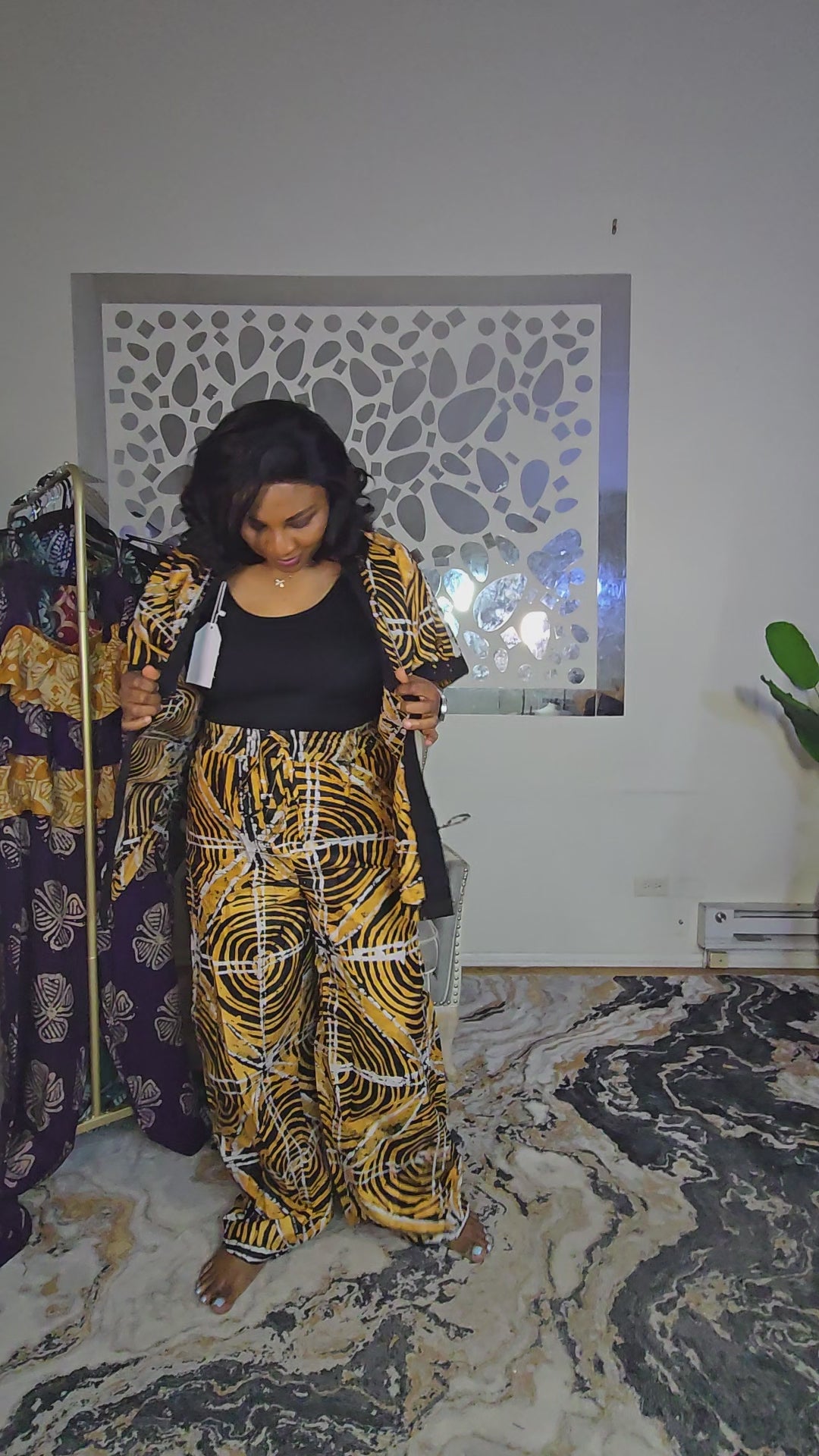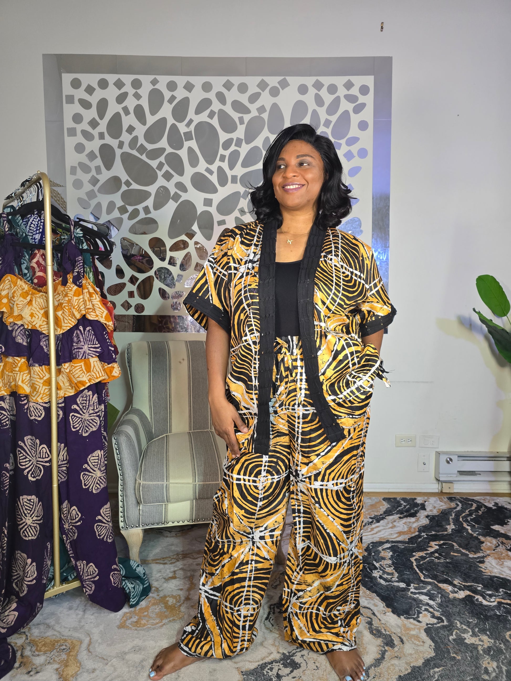 This Kimono 2pc set is crafted from high-quality brocade adire fabric in a bold yellow and black pattern. The kimono jacket showcases intricate Jawu aso oke embellishments along the neckline and chest, enhanced with stylish ruffles on the sides for added flair. Sized Large, the pants measure 44 inches in hip circumference and length, while the top extends 31 inches long. Perfect for cultural celebrations or formal occasions, this ensemble blends traditional charm with contemporary style.
