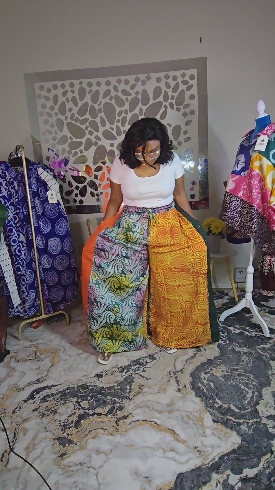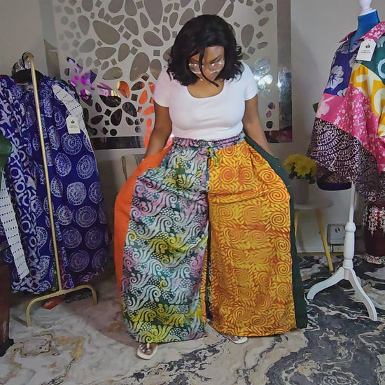 This free-flowing crepe adire pants offer a comfortable fit for sizes US 14-18. With a length of 44 inches, they are crafted from 100% cotton, combining style and breathability for everyday wear.