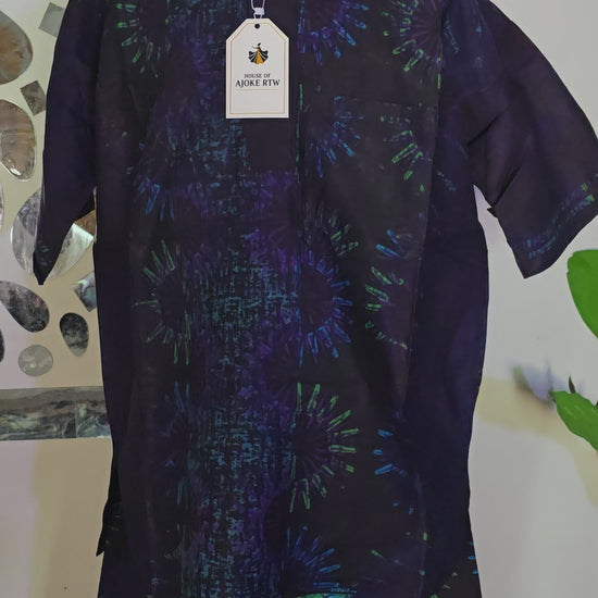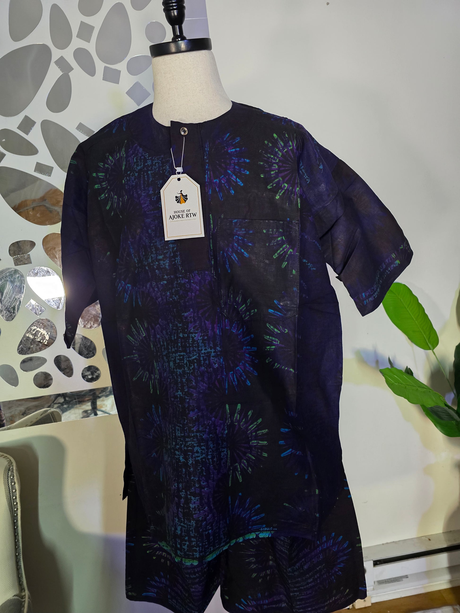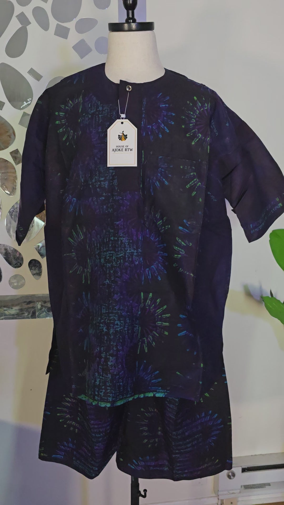 This Men’s Adire 2-piece short set showcases a striking African print made from 100% cotton, blending Blue black with green and blue print highlights. Offered in size XL, the top suits chest sizes 48-50 inches and measures 33 inches long, while the shorts measure 28 inches in length. Perfect for men eager to stand out with a bold and unique look.
