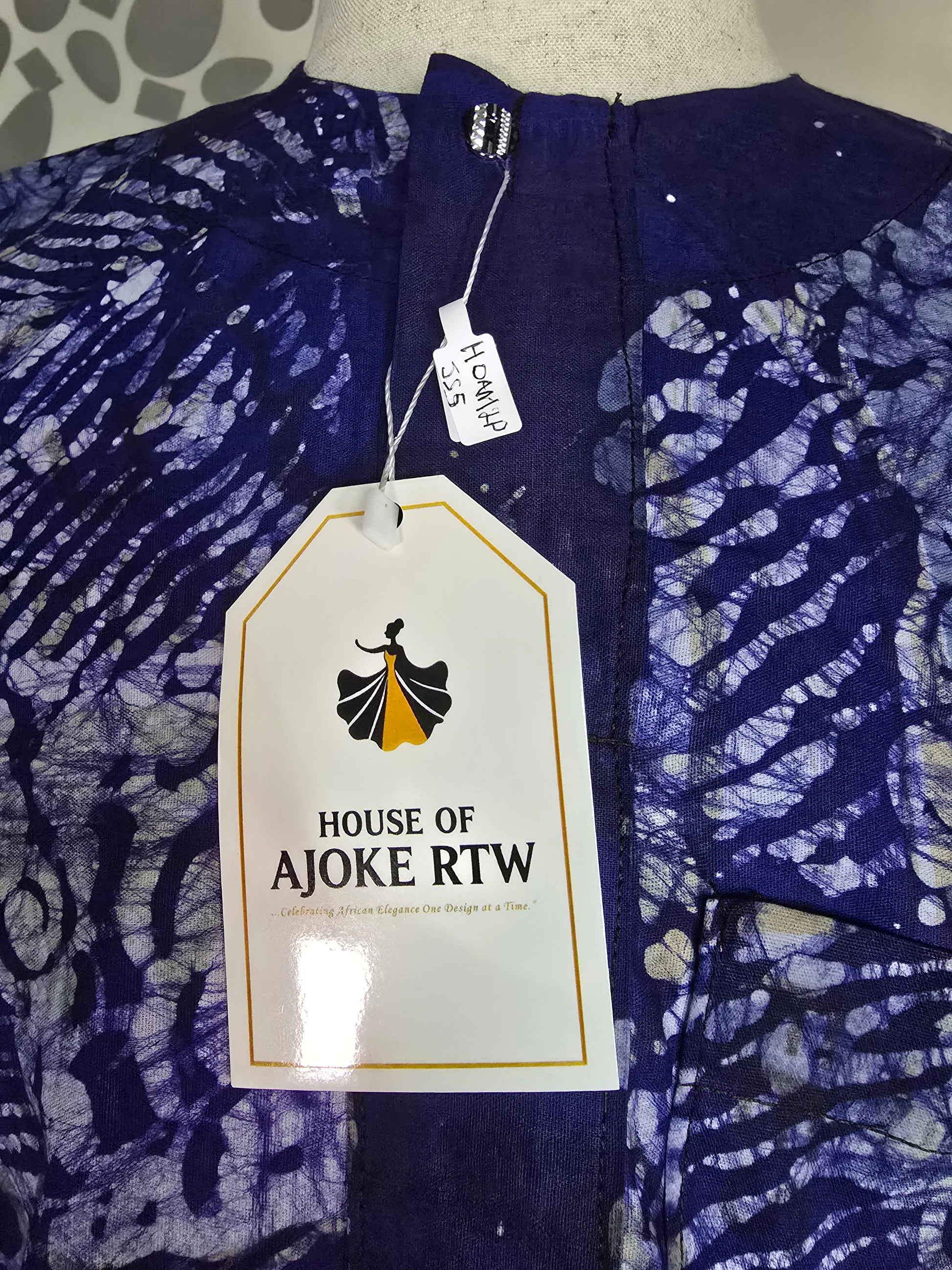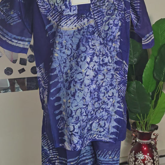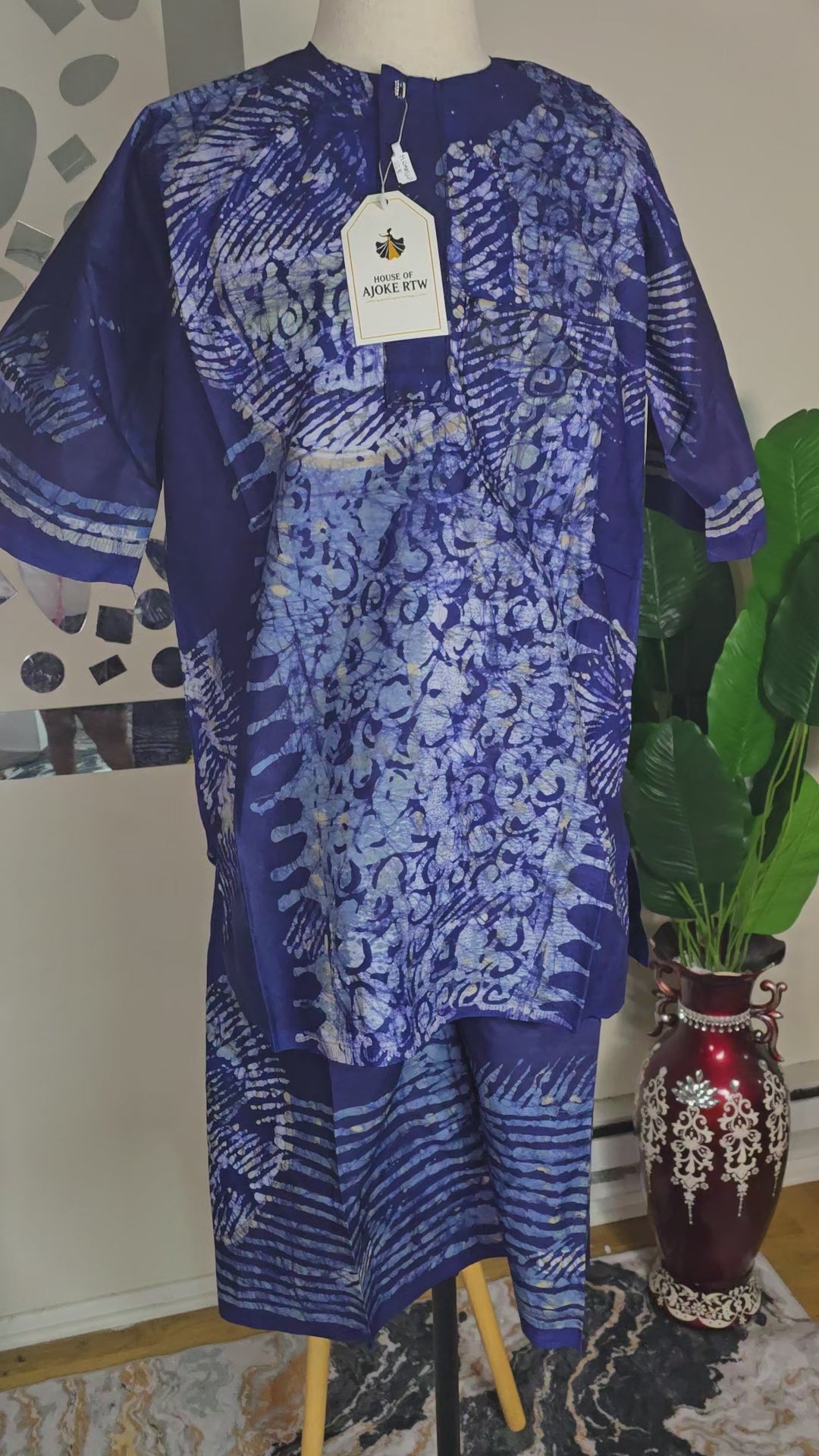This Men’s Adire 2-piece short set features vibrant African print crafted from 100% cotton, combining blue with subtle tan accents. Available in size M, the top fits chest measurements of 44-46 inches with a length of 33 inches, while the shorts have a length of 28 inches. Ideal for men looking to make a distinctive statement with their style.