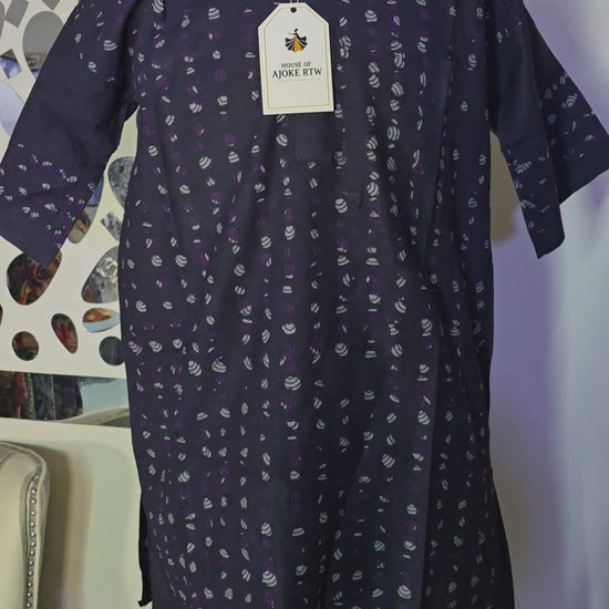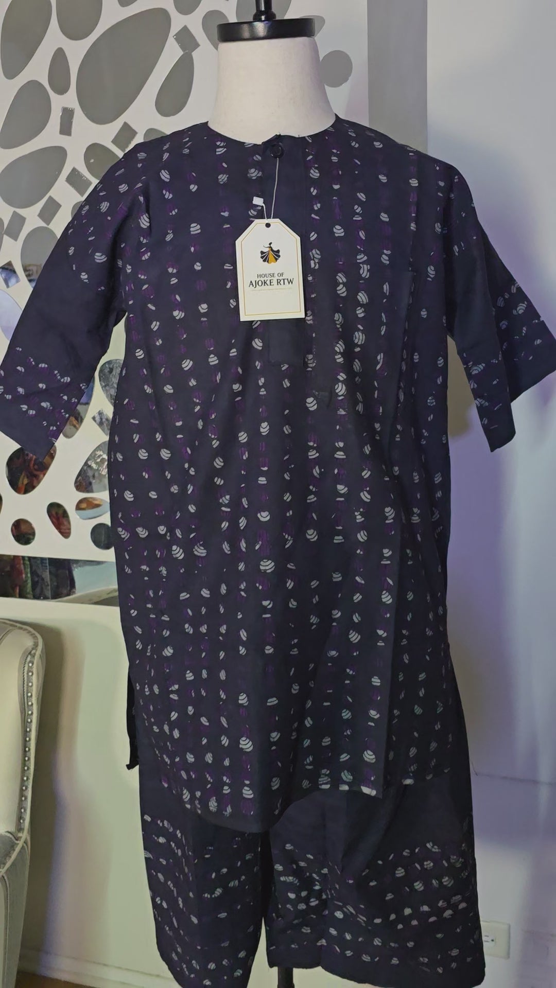This Men’s Adire 2-piece short set features a vibrant African print crafted from 100% cotton, combining Black with hints of purple and white. Available in size S, the top fits chest sizes 42-44 inches with a length of 33 inches, and the shorts are 28 inches long. Ideal for men who want to make a bold, distinctive statement with their style.
