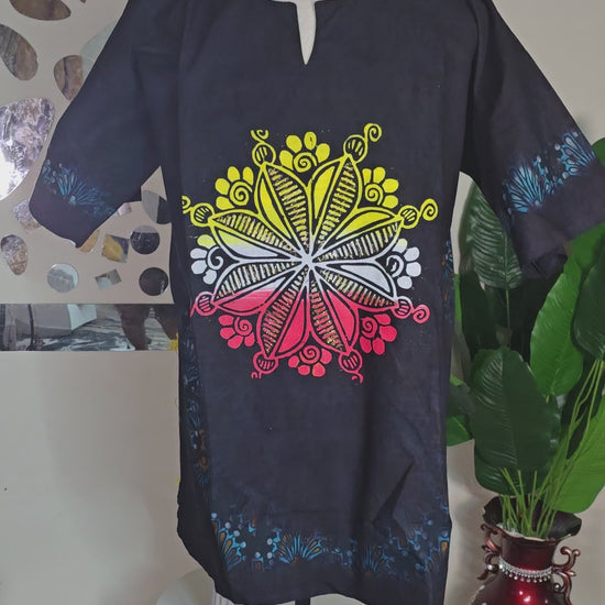This Men’s Adire top showcases a bold African print made from pure cotton, blending black with yellow, white, and red highlights. Designed for size L, it fits chest measurements of 46-48 inches and has a 33-inch length. Sold separately from shorts, this top is perfect for men seeking a unique and confident look that stands out.