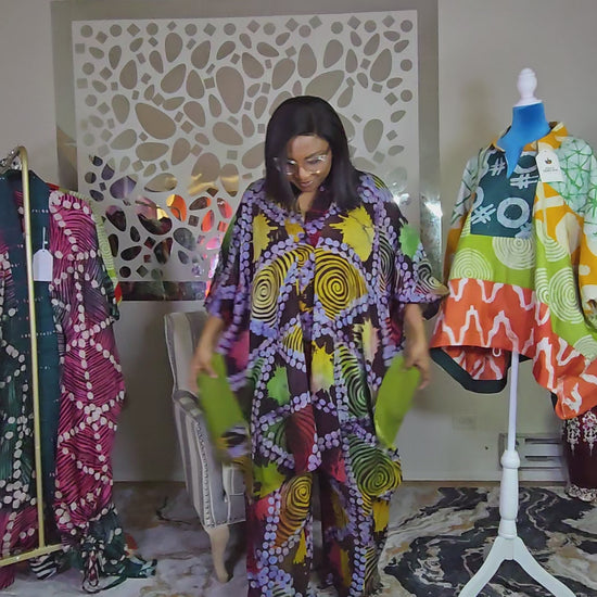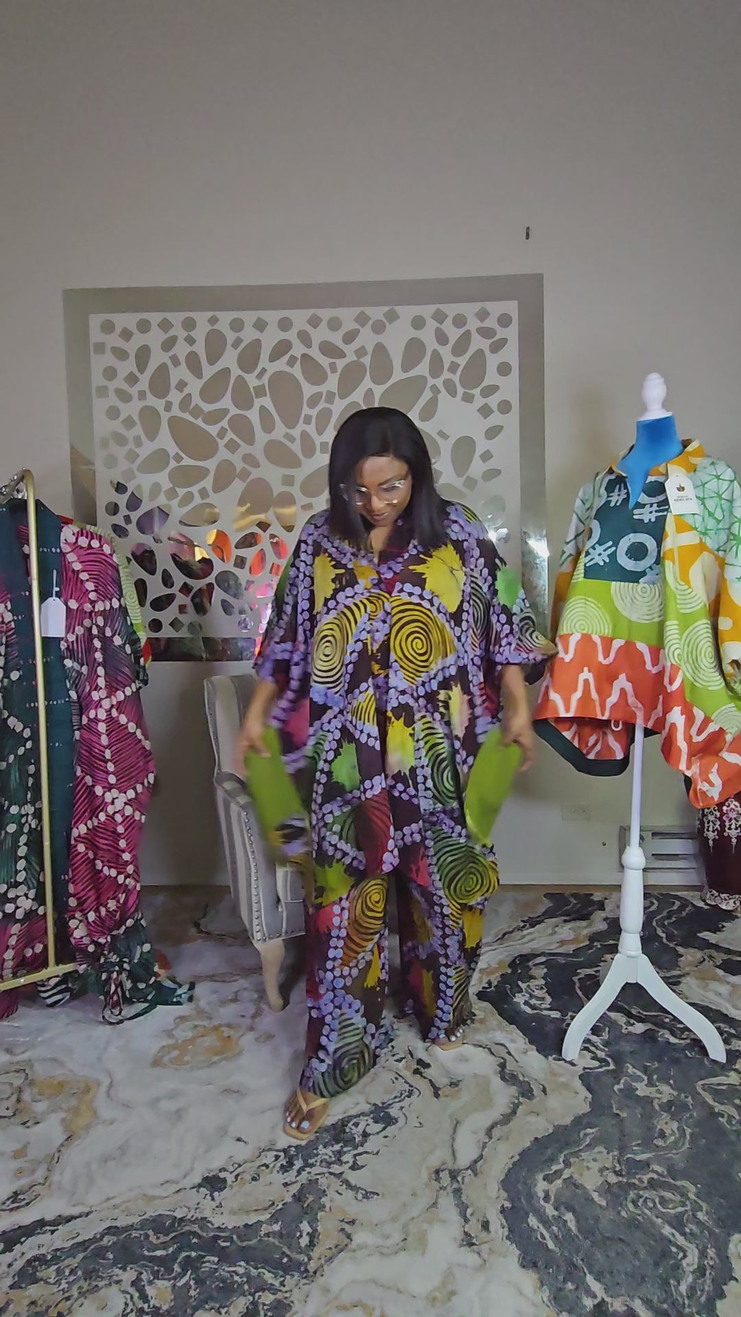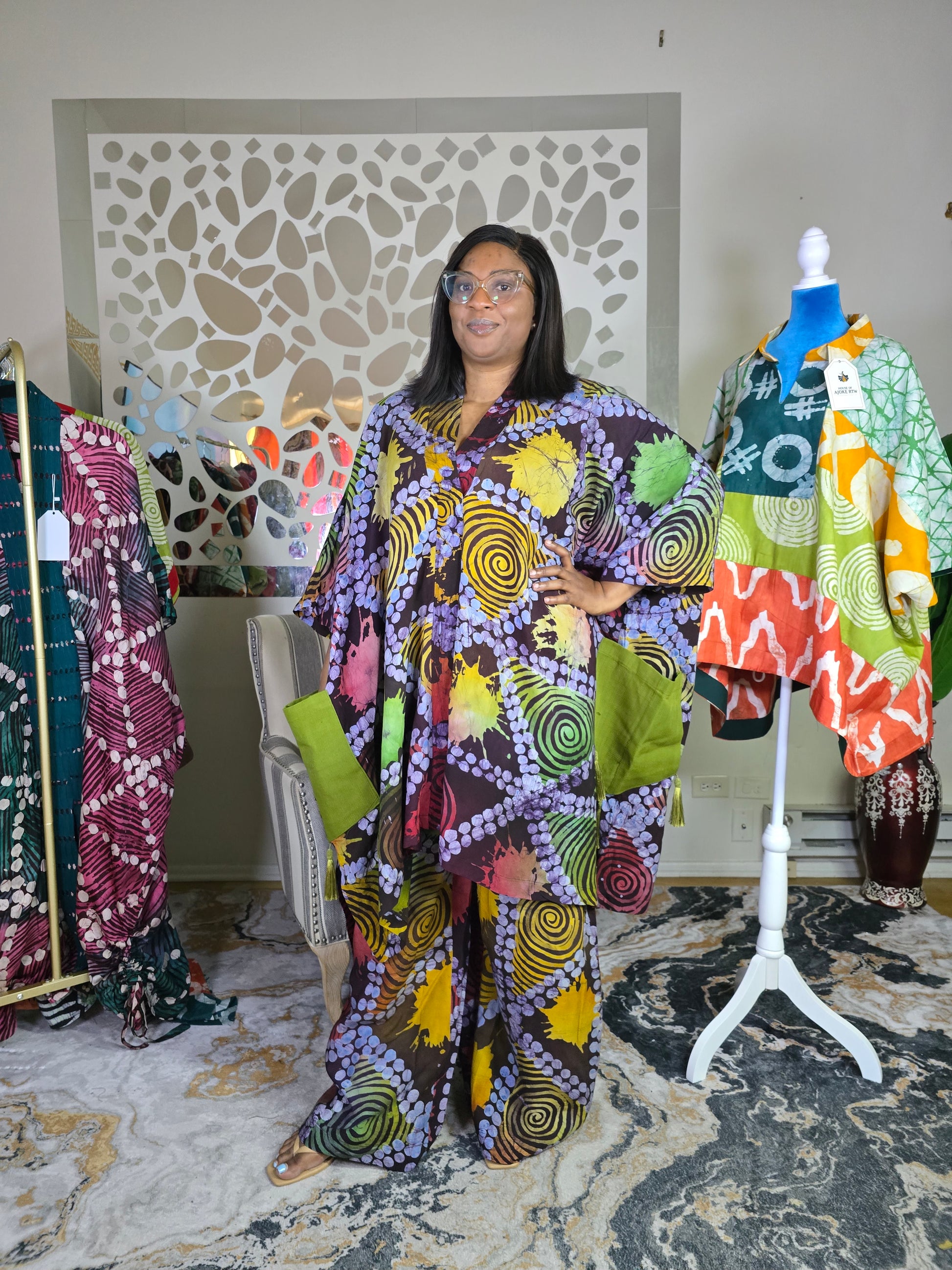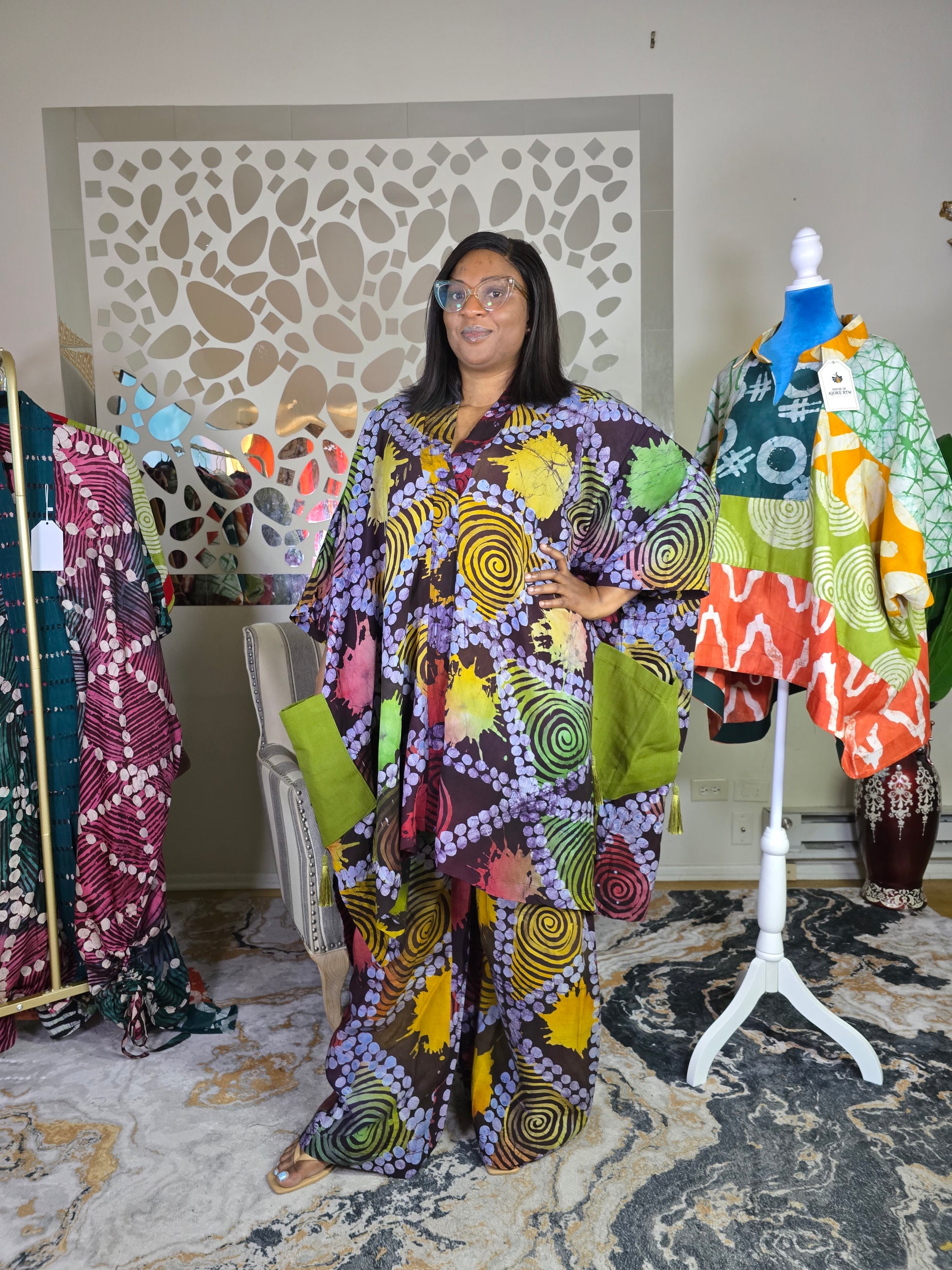 Experience comfort and style with the Big Cotton Olive Green 2pc Pant Set. Crafted from breezy, flowy fabric, it features pockets made from premium Aso Oke material. Ideal for both casual outings and special occasions, the top offers a relaxed, one-size-fits-all design. The pants fit US sizes 14-16, with a length of 43-44 inches and hip measurements of 48-50 inches, ensuring a flattering free fit. Elevate your wardrobe with this versatile set that blends traditional textures with modern ease.