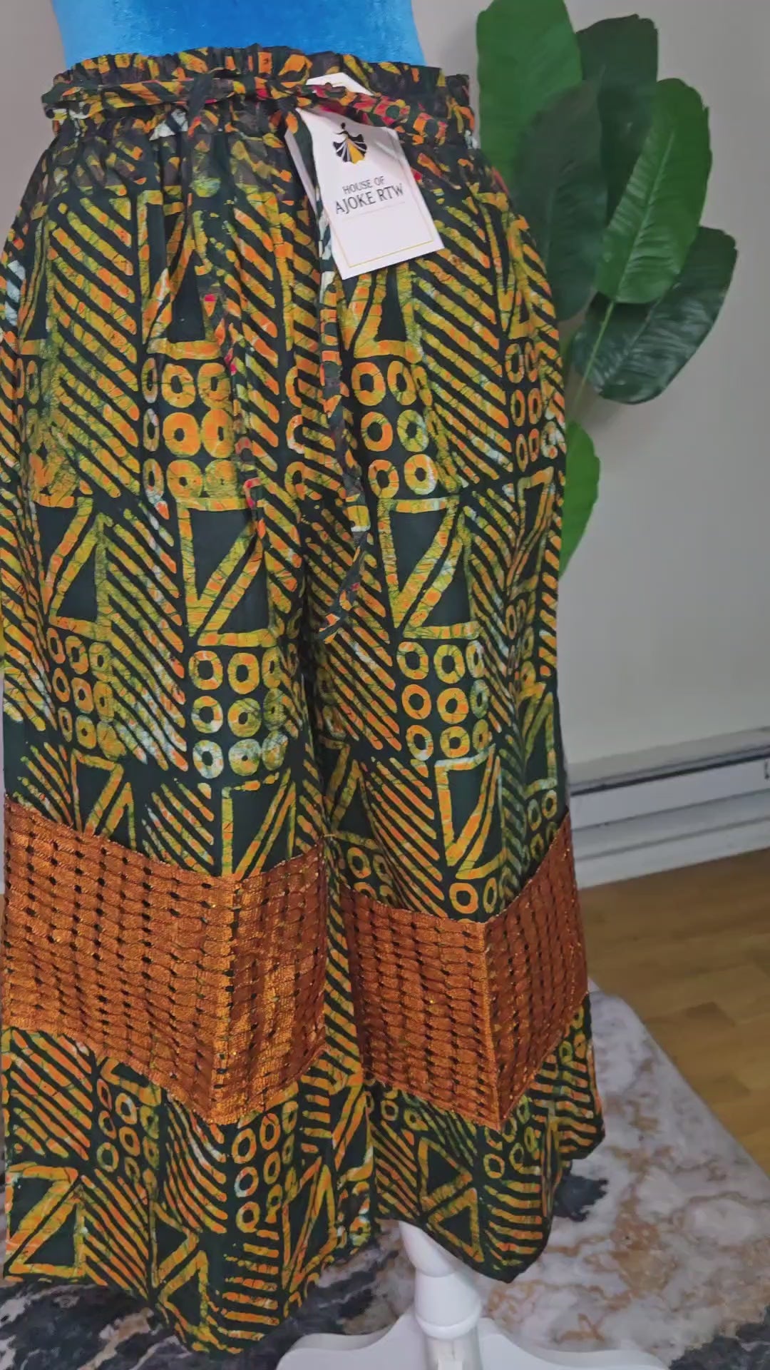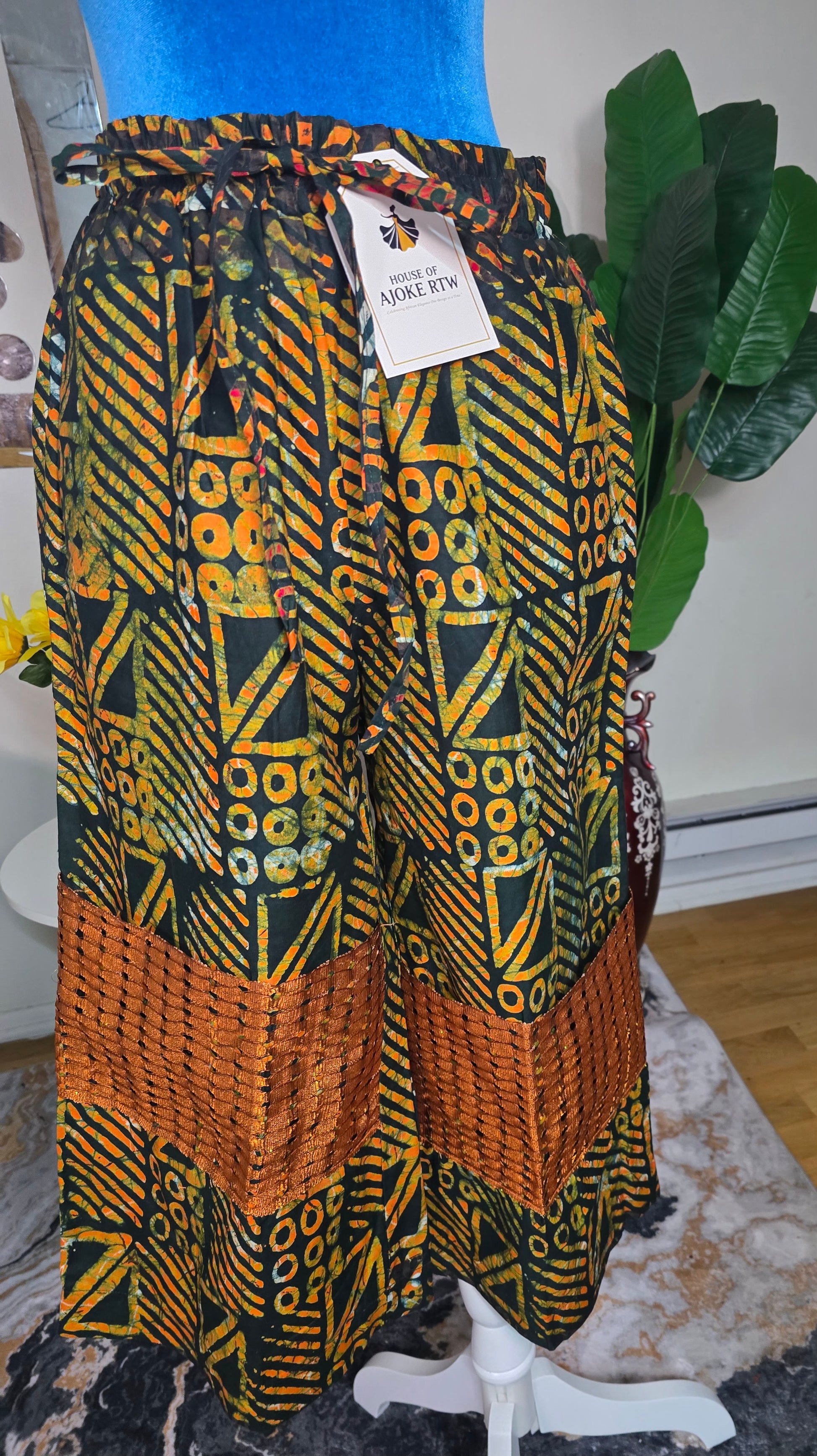 This three-quarter Adire pants offer versatility for both casual and professional looks. Crafted from 100% cotton polished batik Adire fabric and accented with premium Jawu Aso Oke detailing, they showcase refined African artistry at its best.