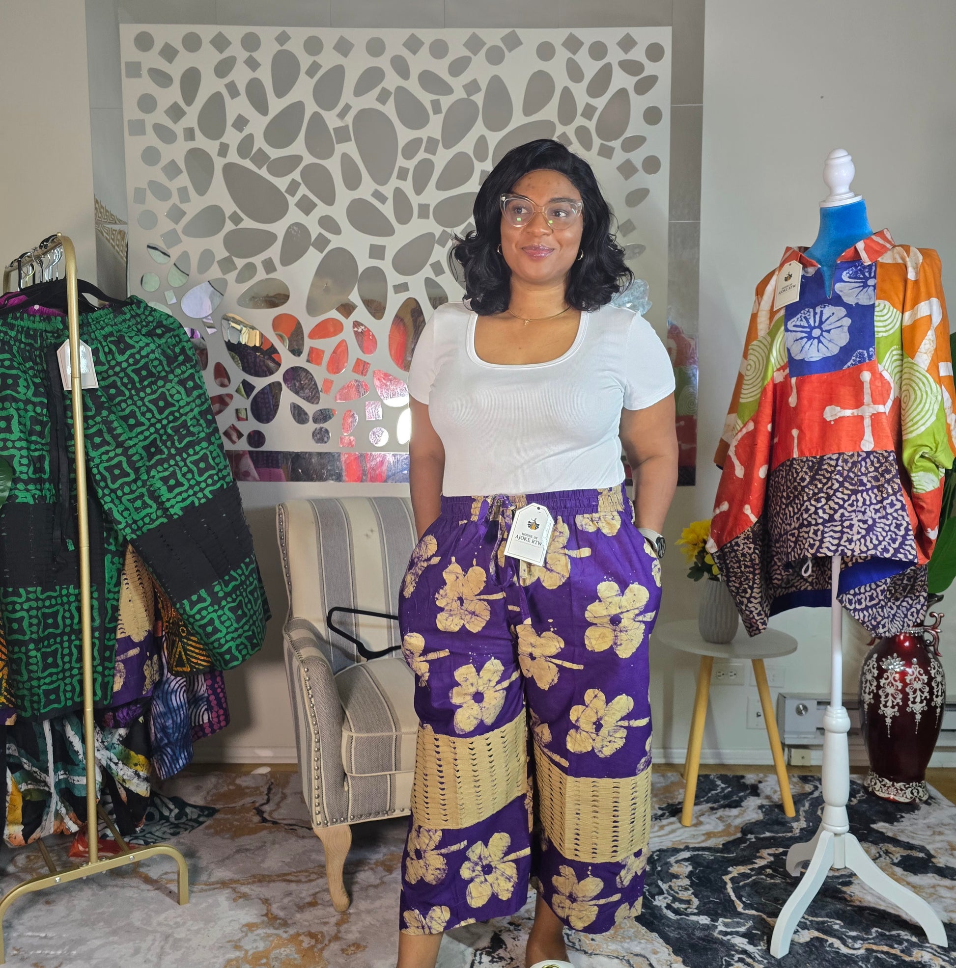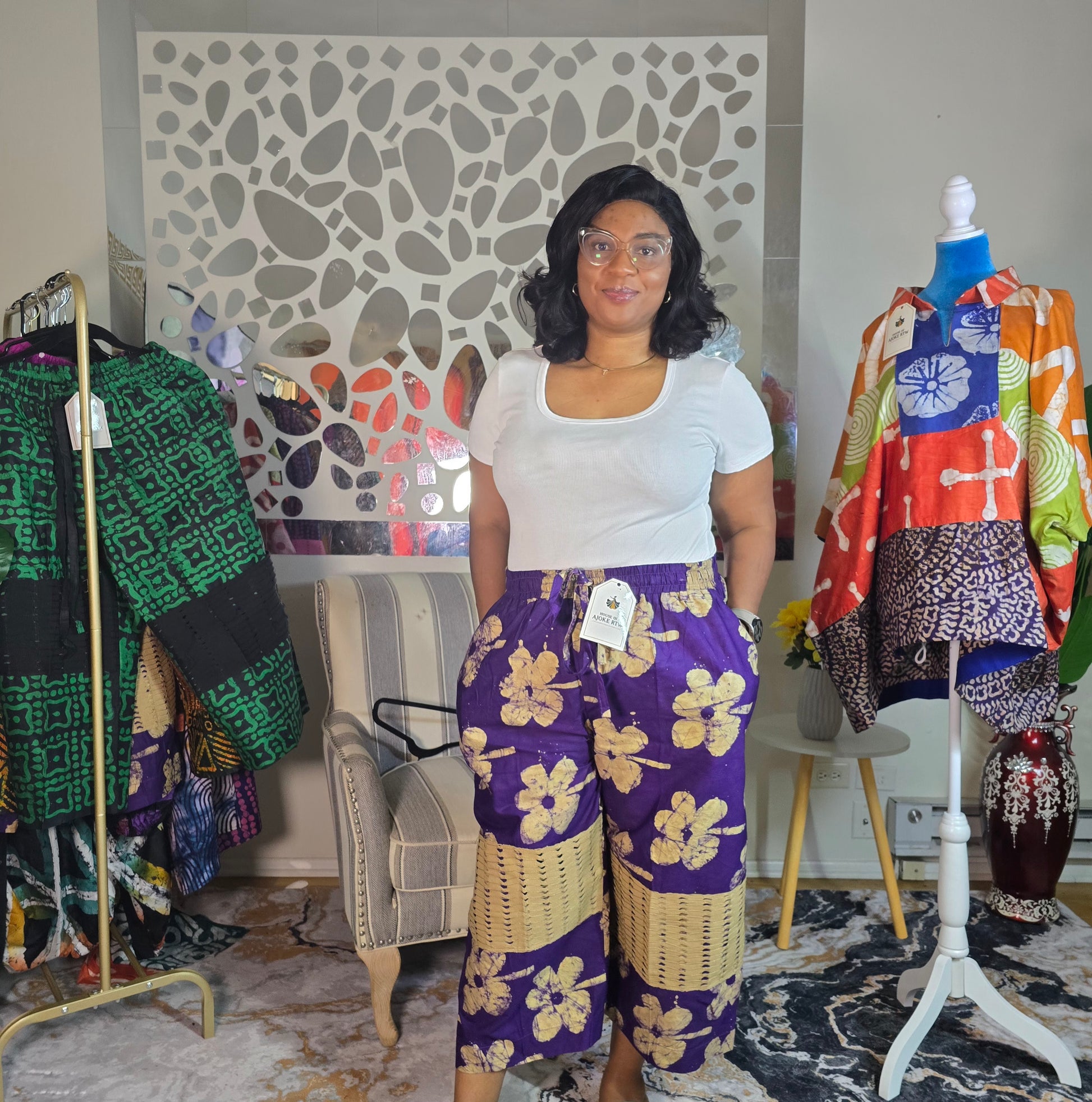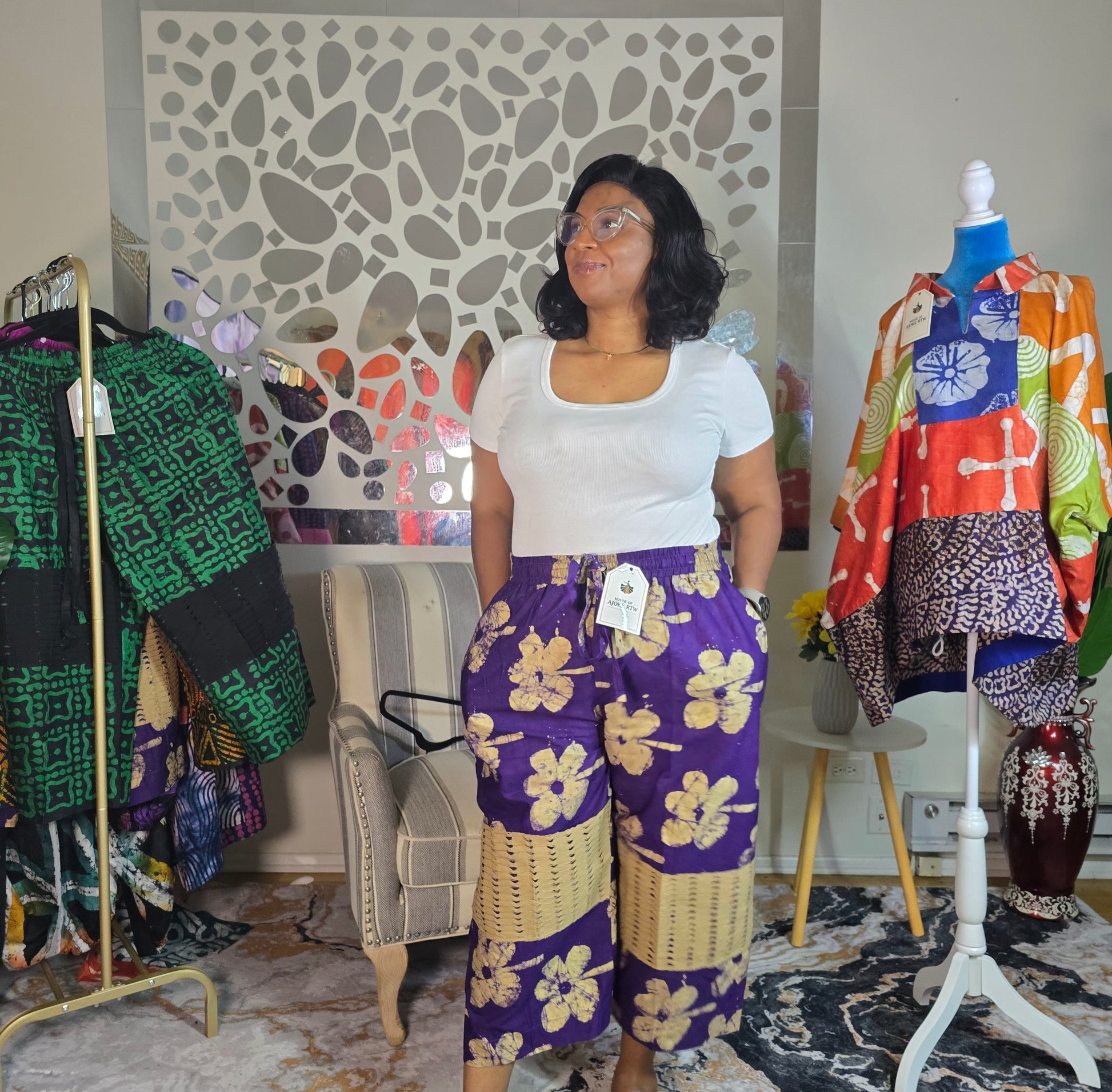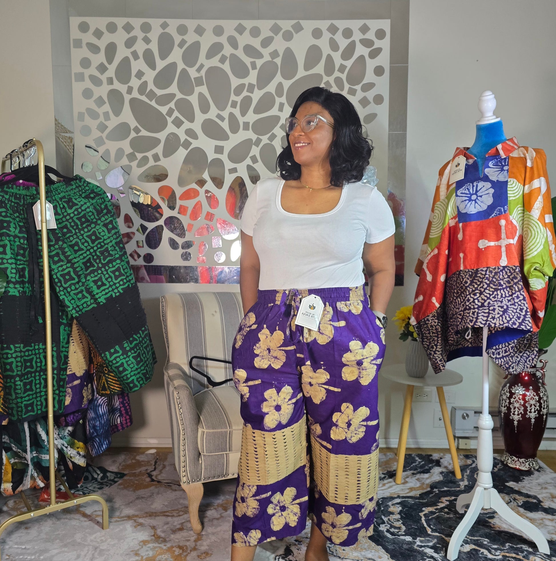 These three-quarter Adire pants effortlessly bridge casual and professional wear. Crafted from 100% cotton polished batik Adire fabric and adorned with elegant Jawu Aso Oke details, they exemplify outstanding African craftsmanship. Offered in Large, ideal for US sizes 12-14 with a 48-inch hip and 33-inch length, and also in XL with a 52-inch hip and 35-inch length, these pants deliver both comfort and style with ease.
