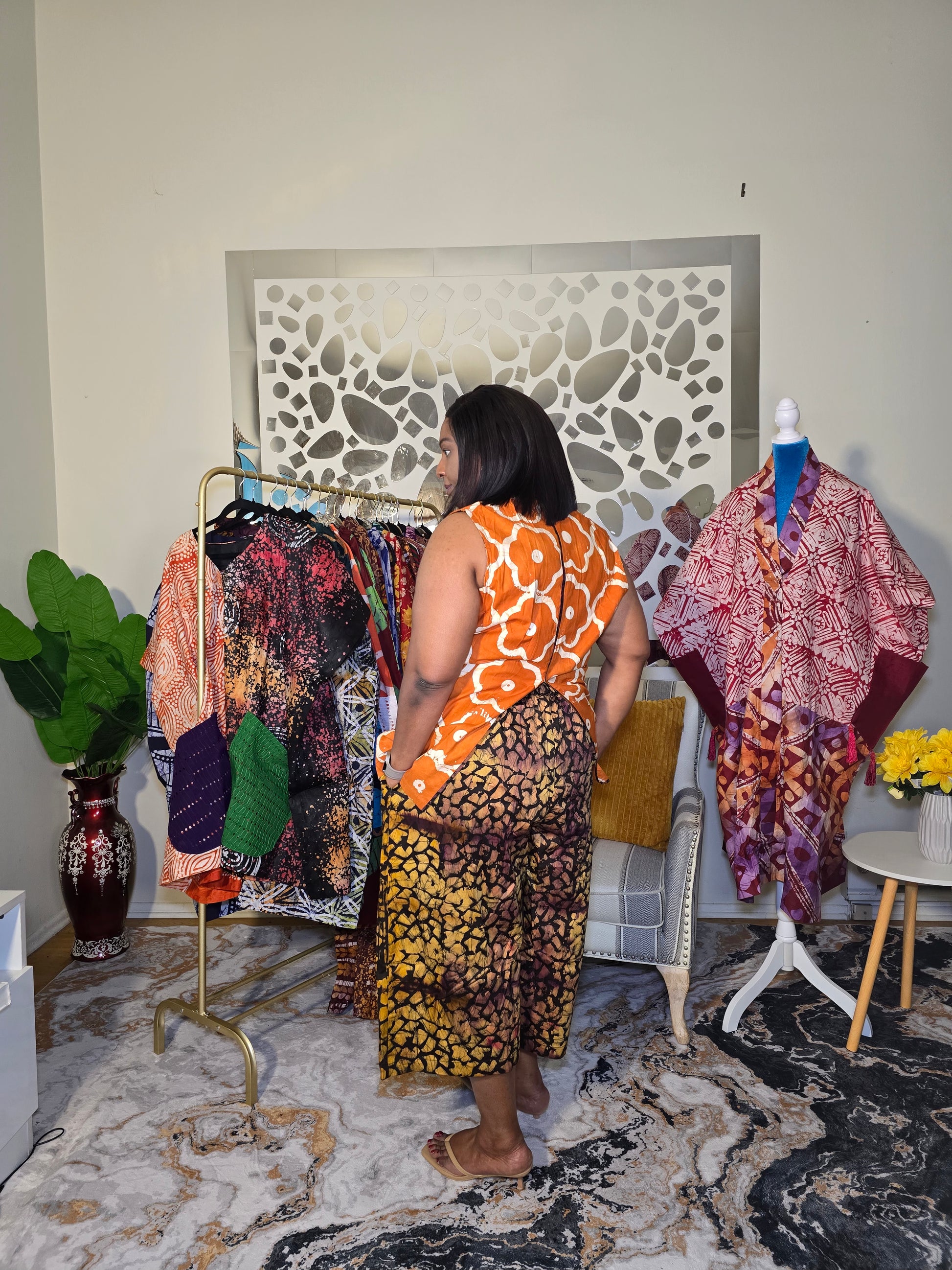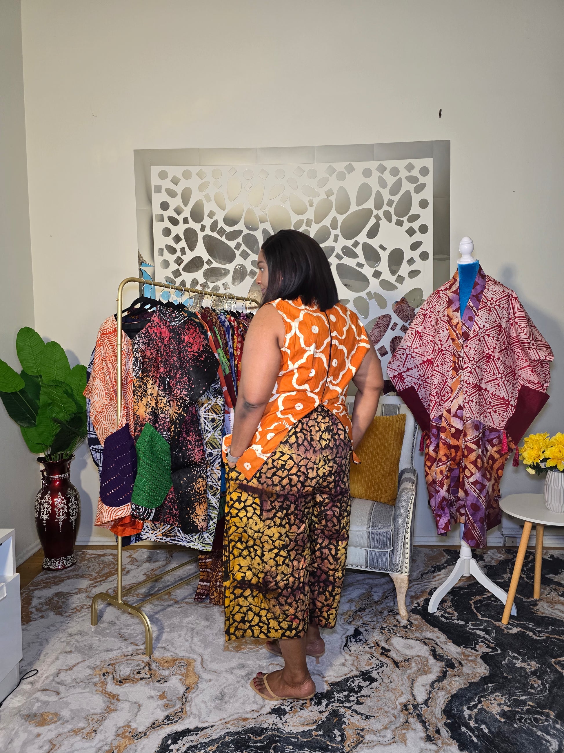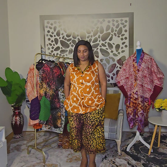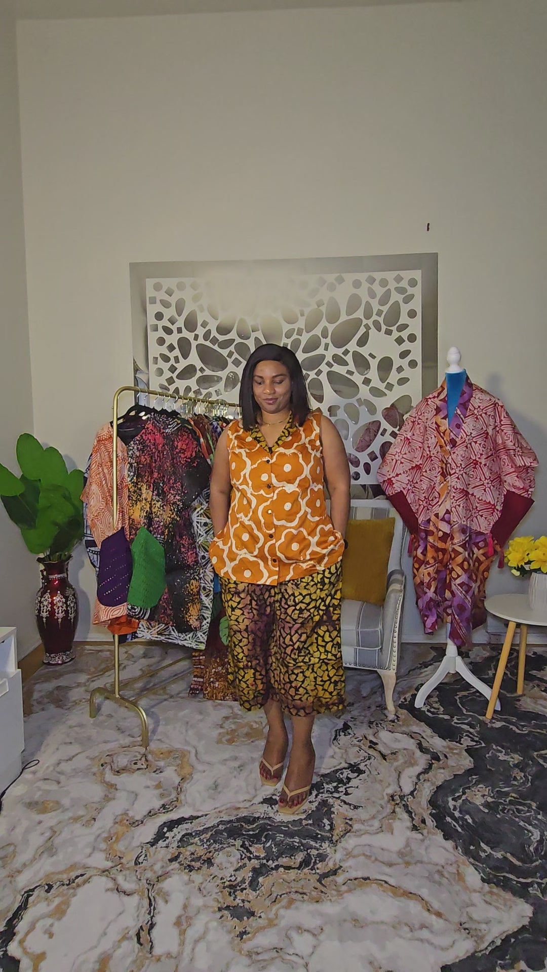 This Orange and brown three-quarter sleeve two-piece set features a bold cotton adire design. Available in XL with top bust size 44 and pant hip size 52, it combines style and versatility, making it an ideal choice for the modern woman’s everyday wardrobe.