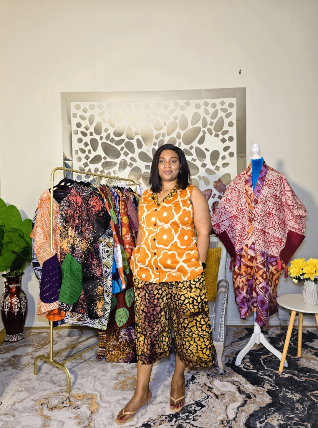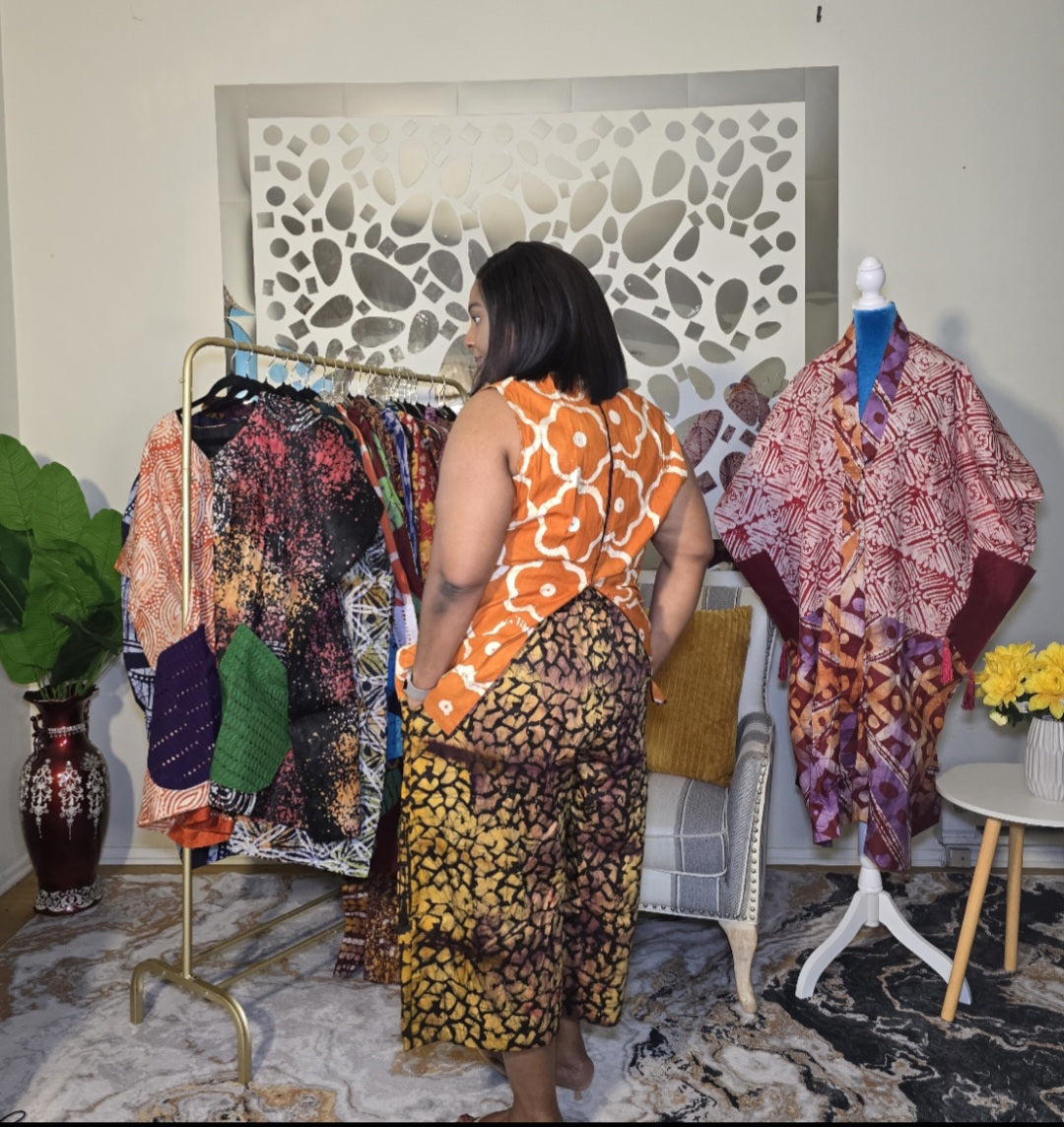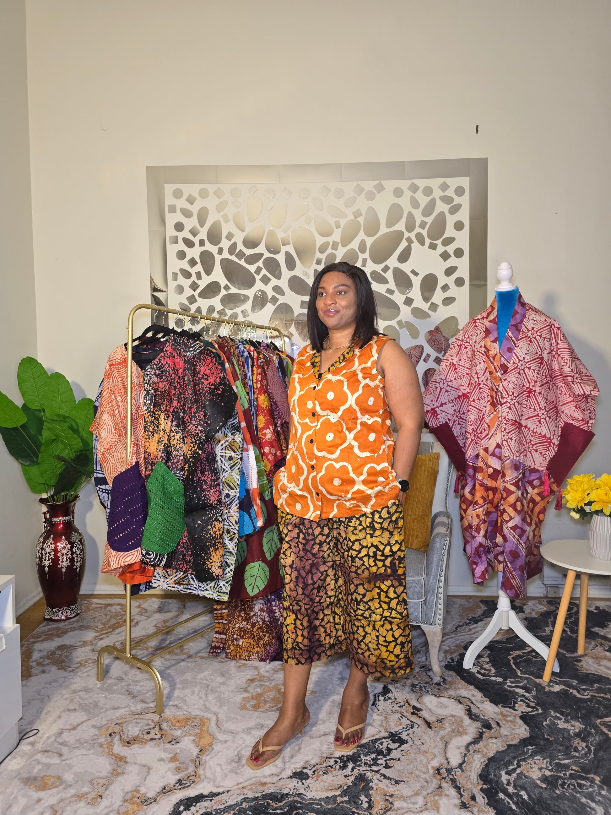 This Orange and brown three-quarter sleeve two-piece set features a bold cotton adire design. Available in XL with top bust size 44 and pant hip size 52, it combines style and versatility, making it an ideal choice for the modern woman’s everyday wardrobe.