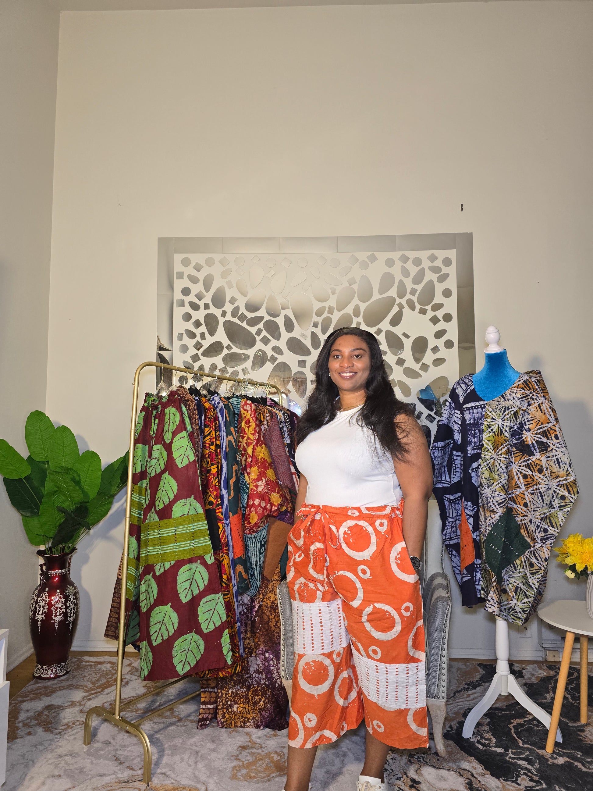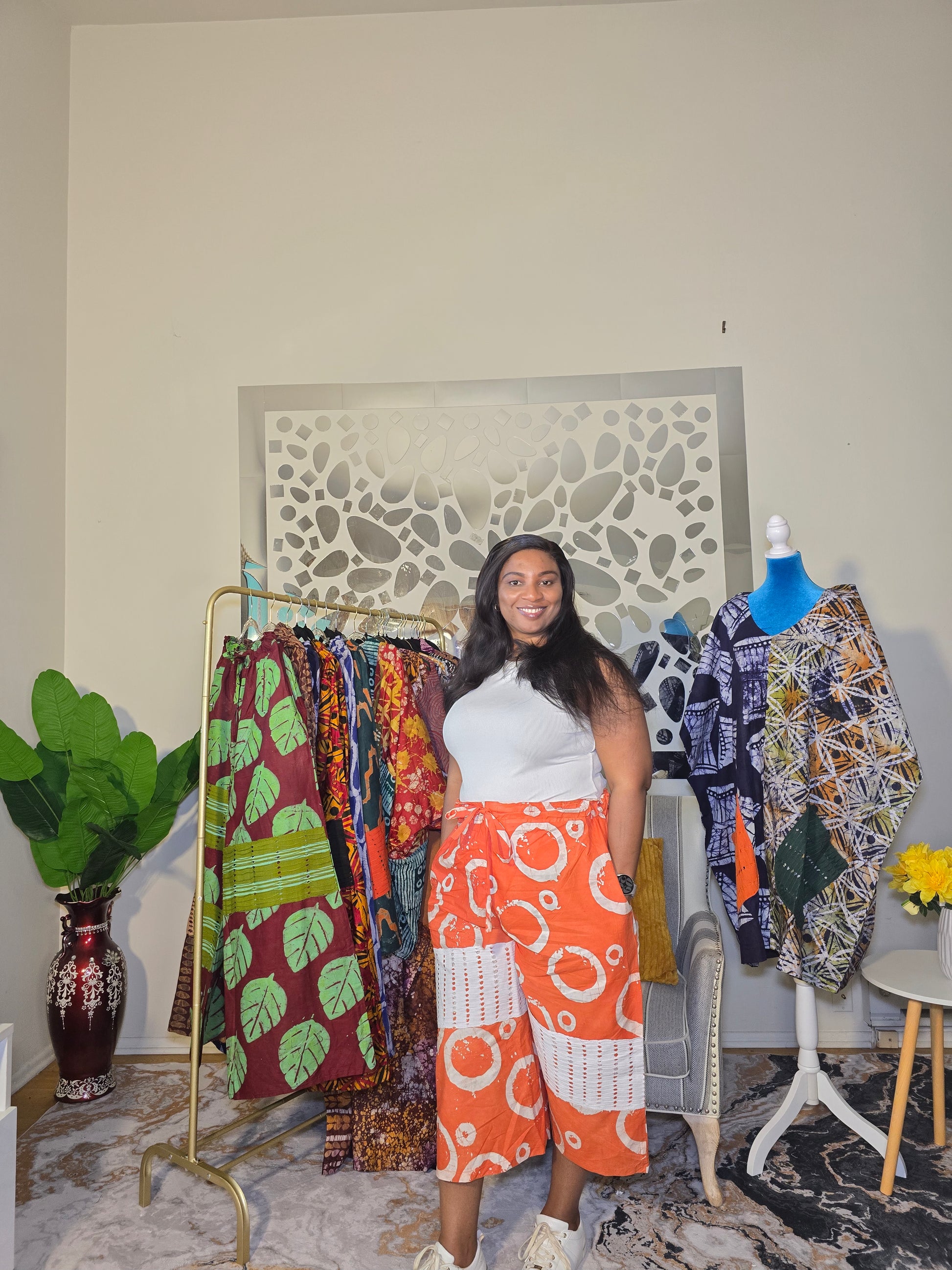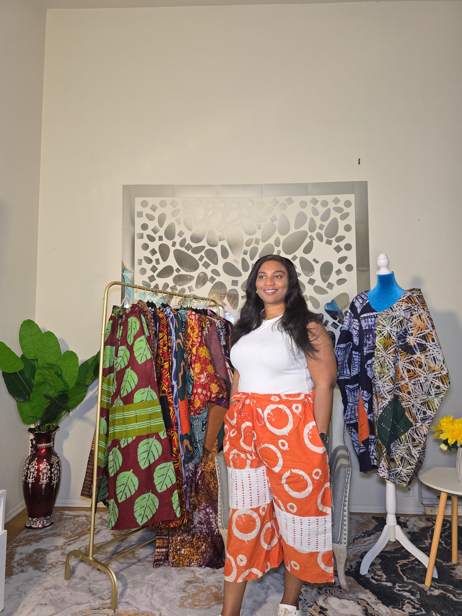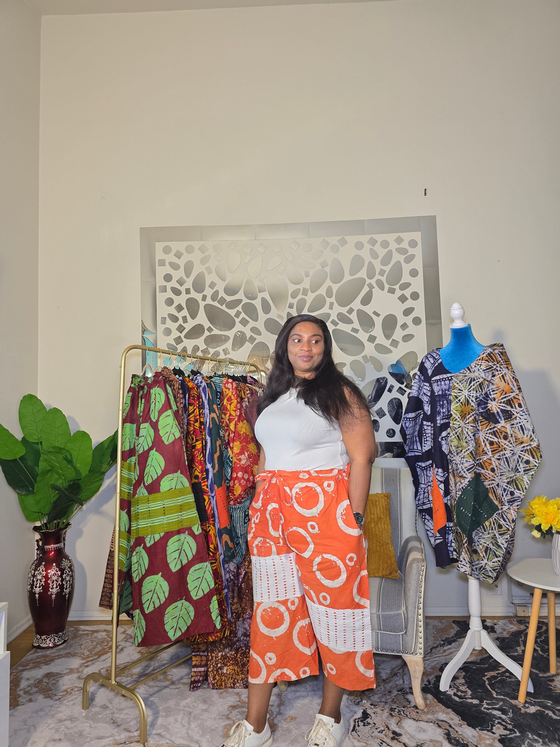 These three-quarter Adire pants blend style and function, ideal for casual outings or professional settings. Made from 100% cotton polished batik Adire fabric, they feature exquisite Jawu Aso Oke accents that highlight authentic African craftsmanship. Designed to fit US sizes 12-16, with measurements L-33 and H-46-48, they offer both comfort and elegance.